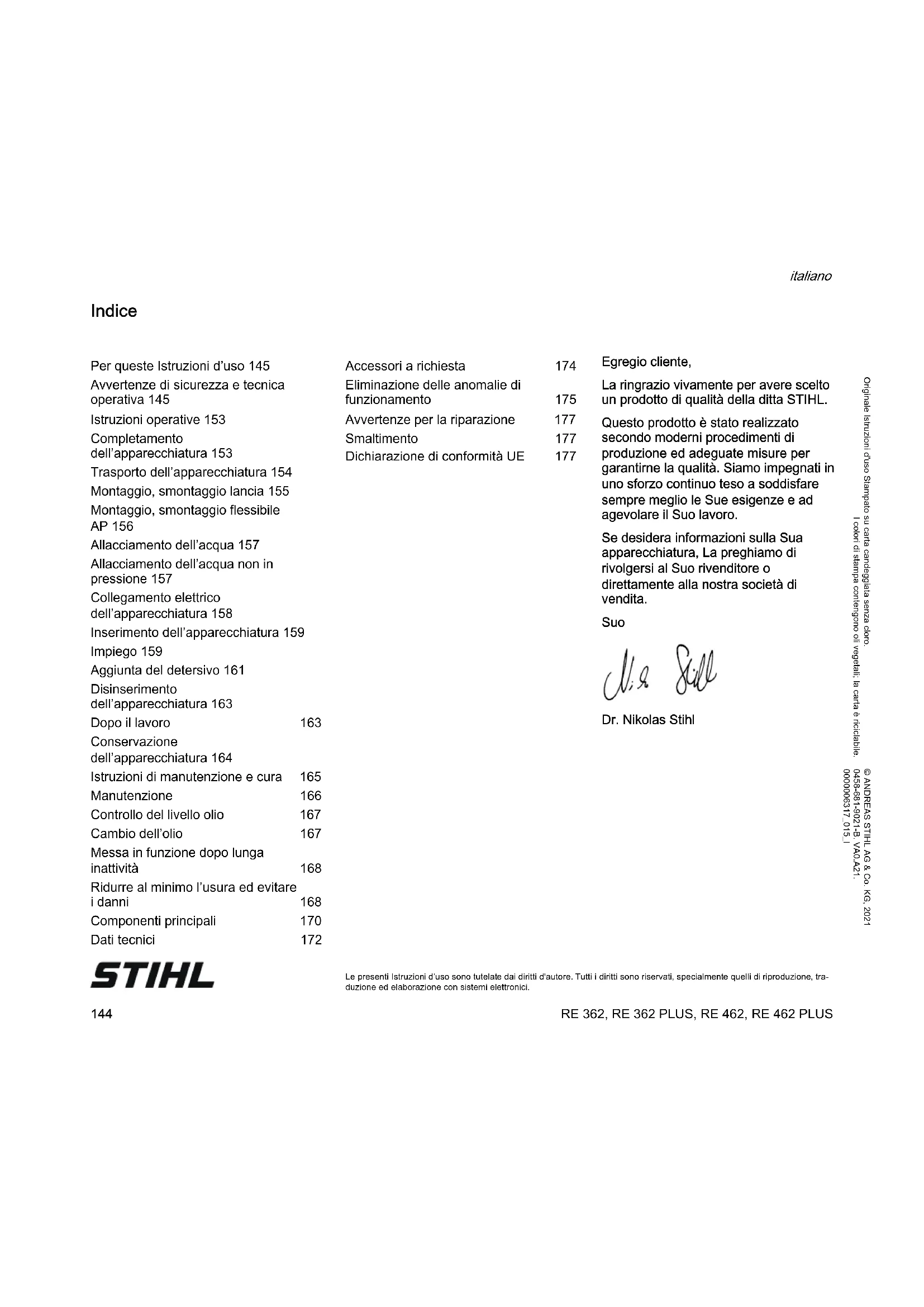 Le presenti Istruzioni d’uso sono tutelate dai diritti d'autore. Tutti i diritti sono riservati, specialmente quelli di riproduzione, tra- duzione ed elaborazione con sistemi elettronici. Indice Egregio cliente, La ringrazio vivamente per avere scelto un prodotto di qualità della ditta STIHL. Questo prodotto è stato realizzato secondo moderni procedimenti di produzione ed adeguate misure per garantirne la qualità. Siamo impegnati in uno sforzo continuo teso a soddisfare sempre meglio le Sue esigenze e ad agevolare il Suo lavoro. Se desidera informazioni sulla Sua apparecchiatura, La preghiamo di rivolgersi al Suo rivenditore o direttamente alla nostra società di vendita. Suo Dr. Nikolas Stihl Per queste Istruzioni d’uso 145 Avvertenze di sicurezza e tecnica operativa 145 Istruzioni operative 153 Completamento dell’apparecchiatura 153 Trasporto dell’apparecchiatura 154 Montaggio, smontaggio lancia 155 Montaggio, smontaggio flessibile AP 156 Allacciamento dell’acqua 157 Allacciamento dell’acqua non in pressione 157 Collegamento elettrico dell’apparecchiatura 158 Inserimento dell’apparecchiatura 159 Impiego 159 Aggiunta del detersivo 161 Disinserimento dell’apparecchiatura 163 Dopo il lavoro 163 Conservazione dell’apparecchiatura 164 Istruzioni di manutenzione e cura 165 Manutenzione 166 Controllo del livello olio 167 Cambio dell’olio 167 Messa in funzione dopo lunga inattività 168 Ridurre al minimo l’usura ed evitare i danni 168 Componenti principali 170 Dati tecnici 172 Accessori a richiesta 174 Eliminazione delle anomalie di funzionamento 175 Avvertenze per la riparazione 177 Smaltimento 177 Dichiarazione di conformità UE 177RE 362, RE 362 PLUS, RE 462, RE 462 PLUS italiano