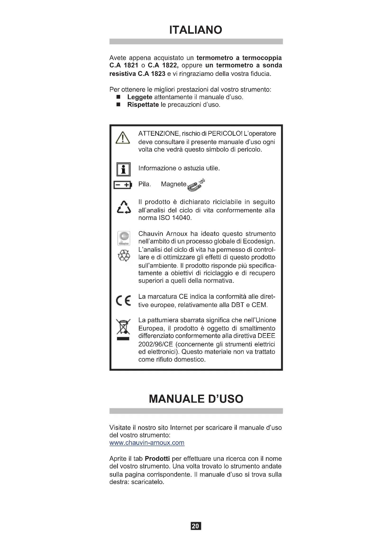 ATTENZIONE, rischio di PERICOLO! L’operatore deve consultare il presente manuale d’uso ogni volta che vedrà questo simbolo di pericolo. Informazione o astuzia utile. Pila. Magnete. Il prodotto è dichiarato riciclabile in seguito all’analisi del ciclo di vita conformemente alla norma ISO 14040. Chauvin Arnoux ha ideato questo strumento nell’ambito di un processo globale di Ecodesign. L’analisi del ciclo di vita ha permesso di control- lare e di ottimizzare gli effetti di questo prodotto sull’ambiente. Il prodotto risponde più specica- tamente a obiettivi di riciclaggio e di recupero superiori a quelli della normativa. La marcatura CE indica la conformità alle diret- tive europee, relativamente alla DBT e CEM. La pattumiera sbarrata signica che nell’Unione Europea, il prodotto è oggetto di smaltimento differenziato conformemente alla direttiva DEEE 2002/96/CE (concernente gli strumenti elettrici ed elettronici). Questo materiale non va trattato come riuto domestico. Avete appena acquistato un termometro a termocoppia C.A 1821 o C.A 1822, oppure un termometro a sonda resistiva C.A 1823 e vi ringraziamo della vostra ducia. Per ottenere le migliori prestazioni dal vostro strumento: Leggete attentamente il manuale d’uso. Rispettate le precauzioni d’uso.