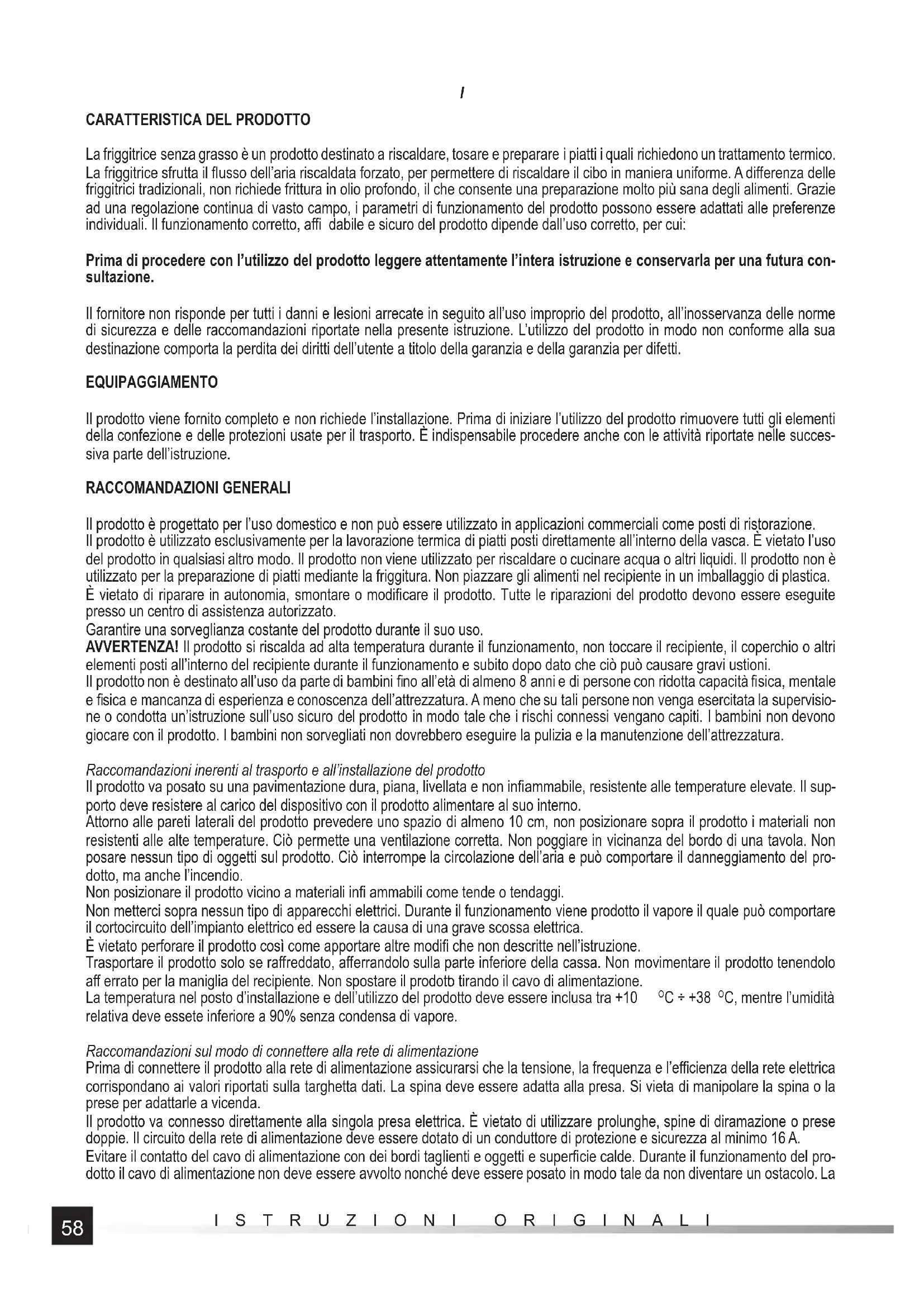 La friggitrice senza grasso è un prodotto destinato a riscaldare, tosare e preparare i piatti i quali richiedono un trattamento termico. La friggitrice sfrutta il fl usso dell’aria riscaldata forzato, per permettere di riscaldare il cibo in maniera uniforme. A diff erenza delle friggitrici tradizionali, non richiede frittura in olio profondo, il che consente una preparazione molto più sana degli alimenti. Grazie ad una regolazione continua di vasto campo, i parametri di funzionamento del prodotto possono essere adattati alle preferenze individuali. Il funzionamento corretto, affi dabile e sicuro del prodotto dipende dall’uso corretto, per cui: Prima di procedere con l’utilizzo del prodotto leggere attentamente l’intera istruzione e conservarla per una futura con- sultazione. Il fornitore non risponde per tutti i danni e lesioni arrecate in seguito all’uso improprio del prodotto, all’inosservanza delle norme di sicurezza e delle raccomandazioni riportate nella presente istruzione. L’utilizzo del prodotto in modo non conforme alla sua destinazione comporta la perdita dei diritti dell’utente a titolo della garanzia e della garanzia per difetti. EQUIPAGGIAMENTO Il prodotto viene fornito completo e non richiede l’installazione. Prima di iniziare l’utilizzo del prodotto rimuovere tutti gli elementi della confezione e delle protezioni usate per il trasporto. È indispensabile procedere anche con le attività riportate nelle succes- siva parte dell’istruzione. RACCOMANDAZIONI GENERALI Il prodotto è progettato per l’uso domestico e non può essere utilizzato in applicazioni commerciali come posti di ristorazione. Il prodotto è utilizzato esclusivamente per la lavorazione termica di piatti posti direttamente all’interno della vasca. È vietato l’uso del prodotto in qualsiasi altro modo. Il prodotto non viene utilizzato per riscaldare o cucinare acqua o altri liquidi. Il prodotto non è utilizzato per la preparazione di piatti mediante la friggitura. Non piazzare gli alimenti nel recipiente in un imballaggio di plastica. È vietato di riparare in autonomia, smontare o modifi care il prodotto. Tutte le riparazioni del prodotto devono essere eseguite presso un centro di assistenza autorizzato. Garantire una sorveglianza costante del prodotto durante il suo uso. AVVERTENZA! Il prodotto si riscalda ad alta temperatura durante il funzionamento, non toccare il recipiente, il coperchio o altri elementi posti all’interno del recipiente durante il funzionamento e subito dopo dato che ciò può causare gravi ustioni. Il prodotto non è destinato all’uso da parte di bambini fi no all’età di almeno 8 anni e di persone con ridotta capacità fi sica, mentale e fi sica e mancanza di esperienza e conoscenza dell’attrezzatura. A meno che su tali persone non venga esercitata la supervisio- ne o condotta un’istruzione sull’uso sicuro del prodotto in modo tale che i rischi connessi vengano capiti. I bambini non devono giocare con il prodotto. I bambini non sorvegliati non dovrebbero eseguire la pulizia e la manutenzione dell’attrezzatura. Raccomandazioni inerenti al trasporto e all’installazione del prodotto Il prodotto va posato su una pavimentazione dura, piana, livellata e non infi ammabile, resistente alle temperature elevate. Il sup- porto deve resistere al carico del dispositivo con il prodotto alimentare al suo interno. Attorno alle pareti laterali del prodotto prevedere uno spazio di almeno 10 cm, non posizionare sopra il prodotto i materiali non resistenti alle alte temperature. Ciò permette una ventilazione corretta. Non poggiare in vicinanza del bordo di una tavola. Non posare nessun tipo di oggetti sul prodotto. Ciò interrompe la circolazione dell’aria e può comportare il danneggiamento del pro- dotto, ma anche l’incendio. Non posizionare il prodotto vicino a materiali infi ammabili come tende o tendaggi. Non metterci sopra nessun tipo di apparecchi elettrici. Durante il funzionamento viene prodotto il vapore il quale può comportare il cortocircuito dell’impianto elettrico ed essere la causa di una grave scossa elettrica. È vietato perforare il prodotto così come apportare altre modifi che non descritte nell’istruzione. Trasportare il prodotto solo se raff reddato, aff errandolo sulla parte inferiore della cassa. Non movimentare il prodotto tenendolo aff errato per la maniglia del recipiente. Non spostare il prodott o tirando il cavo di alimentazione. La temperatura nel posto d’installazione e dell’utilizzo del prodotto deve essere inclusa tra +10