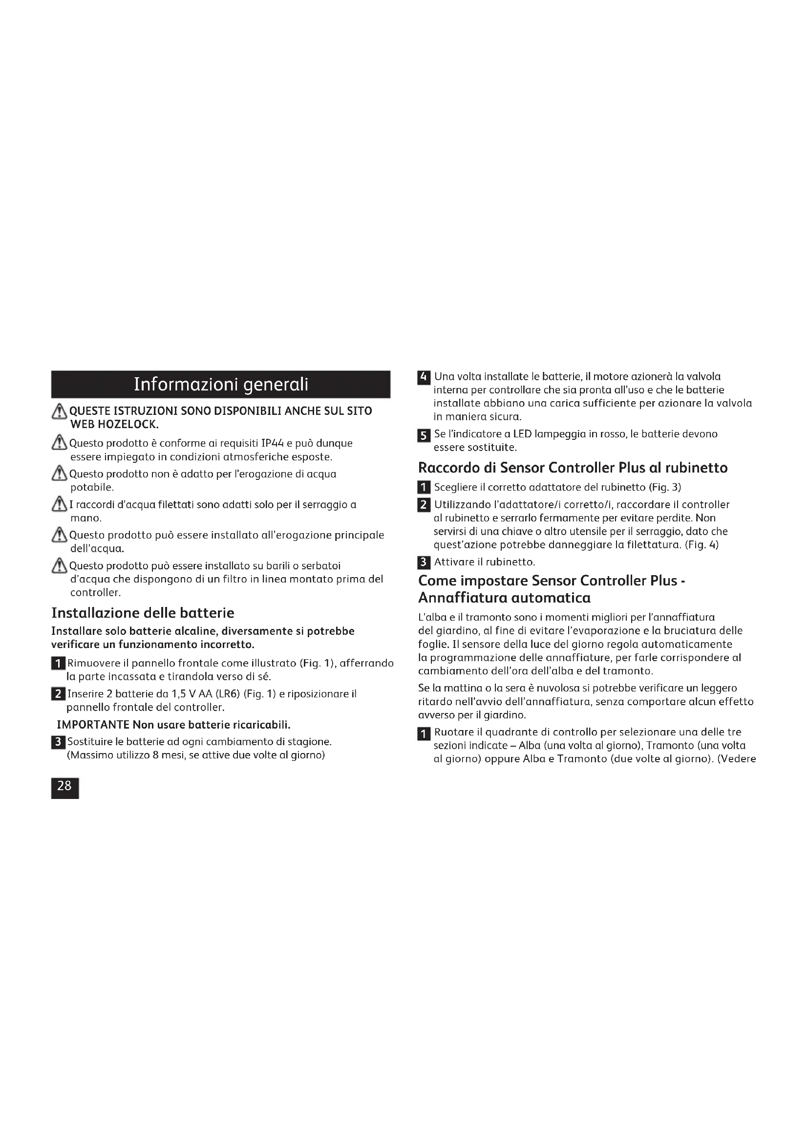 Informazioni generali QUESTE ISTRUZIONI SONO DISPONIBILI ANCHE SUL SITO WEB HOZELOCK. Questo prodotto è conforme ai requisiti IP44 e può dunque essere impiegato in condizioni atmosferiche esposte. Questo prodotto non è adatto per l’erogazione di acqua potabile. I raccordi d’acqua filettati sono adatti solo per il serraggio a mano. Questo prodotto può essere installato all’erogazione principale dell’acqua. Questo prodotto può essere installato su barili o serbatoi d’acqua che dispongono di un filtro in linea montato prima del controller. Installazione delle batterie Installare solo batterie alcaline, diversamente si potrebbe verificare un funzionamento incorretto.
