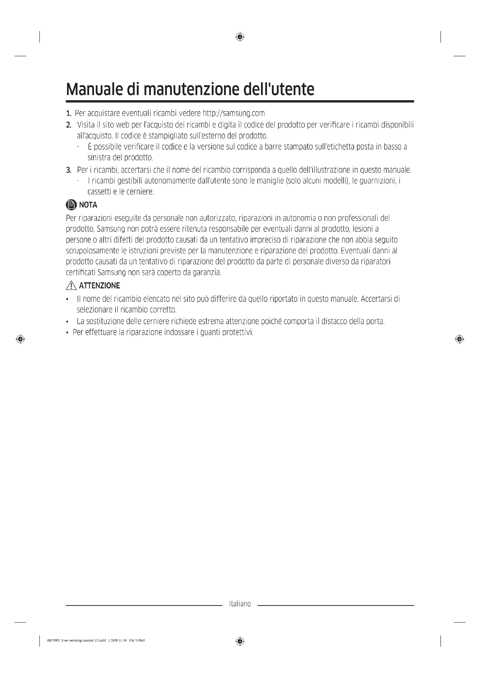 - I ricambi gestibili autonomamente dall'utente sono le maniglie (solo alcuni modelli), le guarnizioni, i cassetti e le cerniere. NOTA Per riparazioni eseguite da personale non autorizzato, riparazioni in autonomia o non professionali del prodotto, Samsung non potrà essere ritenuta responsabile per eventuali danni al prodotto, lesioni a persone o altri difetti del prodotto causati da un tentativo impreciso di riparazione che non abbia seguito scrupolosamente le istruzioni previste per la manutenzione e riparazione del prodotto. Eventuali danni al prodotto causati da un tentativo di riparazione del prodotto da parte di personale diverso da riparatori certicati Samsung non sarà coperto da garanzia. ATTENZIONE