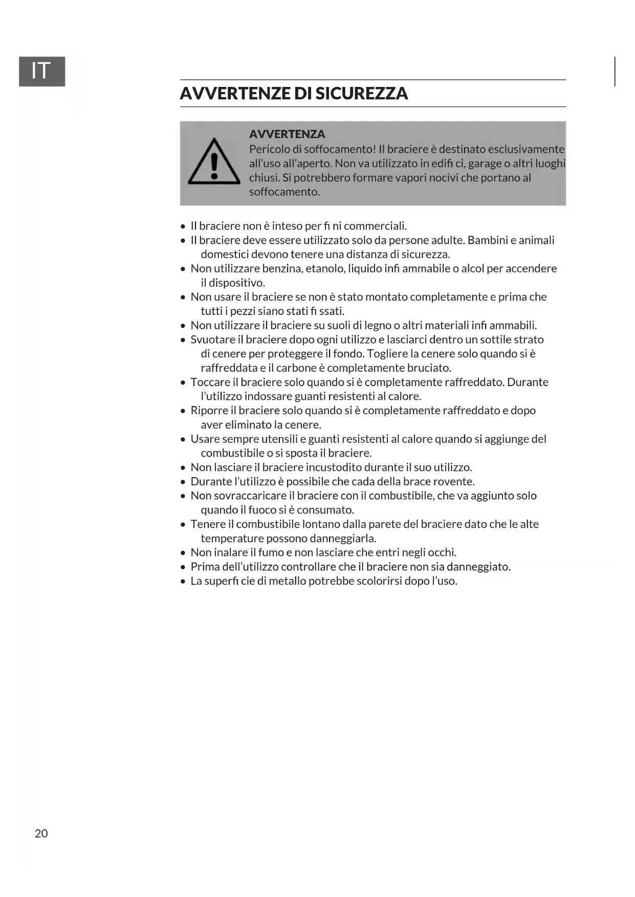 AVVERTENZA Pericolo di soffocamento! Il braciere è destinato esclusivamente all’uso all’aperto. Non va utilizzato in edi ci, garage o altri luoghi chiusi. Si potrebbero formare vapori nocivi che portano al soffocamento.