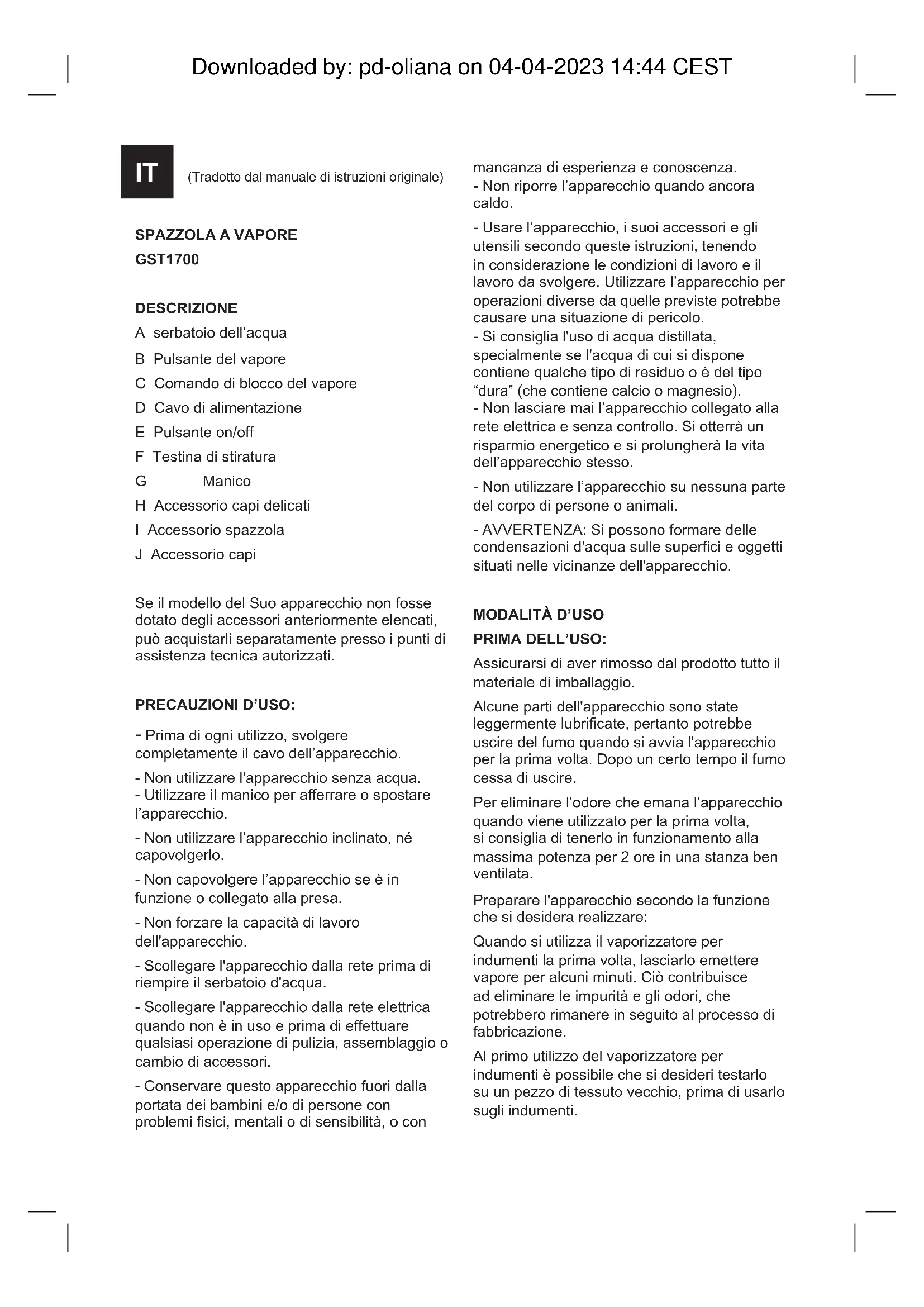 ELÉTRICO EM ÁGUA OU EM QUALQUER OUTRO LÍQUIDO. Limpe o aparelho com um pano húmido com algumas gotas de detergente e seque-o de seguida. Não utilize solventes, produtos com um fator pH ácido ou básico como lixívia, nem produtos abrasivos para a limpeza do aparelho. Nunca mergulhe o aparelho dentro de água ou em qualquer outro líquido, nem o coloque debaixo da torneira. Downloaded by: pd-oliana on 04-04-2023 14:44 CESTSPAZZOLA A VAPORE GST1700 DESCRIZIONE A serbatoio dell’acqua B Pulsante del vapore C Comando di blocco del vapore D Cavo di alimentazione E Pulsante on/off F Testina di stiratura G Manico H Accessorio capi delicati I Accessorio spazzola J Accessorio capi Se il modello del Suo apparecchio non fosse dotato degli accessori anteriormente elencati, può acquistarli separatamente presso i punti di assistenza tecnica autorizzati. PRECAUZIONI D’USO: - Prima di ogni utilizzo, svolgere completamente il cavo dell’apparecchio. - Non utilizzare l'apparecchio senza acqua. - Utilizzare il manico per afferrare o spostare l’apparecchio. - Non utilizzare l’apparecchio inclinato, né capovolgerlo. - Non capovolgere l’apparecchio se è in funzione o collegato alla presa. - Non forzare la capacità di lavoro dell'apparecchio. - Scollegare l'apparecchio dalla rete prima di riempire il serbatoio d'acqua. - Scollegare l'apparecchio dalla rete elettrica quando non è in uso e prima di effettuare qualsiasi operazione di pulizia, assemblaggio o cambio di accessori. - Conservare questo apparecchio fuori dalla portata dei bambini e/o di persone con problemi sici, mentali o di sensibilità, o con mancanza di esperienza e conoscenza. - Non riporre l’apparecchio quando ancora caldo. - Usare l’apparecchio, i suoi accessori e gli utensili secondo queste istruzioni, tenendo in considerazione le condizioni di lavoro e il lavoro da svolgere. Utilizzare l’apparecchio per operazioni diverse da quelle previste potrebbe causare una situazione di pericolo. - Si consiglia l'uso di acqua distillata, specialmente se l'acqua di cui si dispone contiene qualche tipo di residuo o è del tipo “dura” (che contiene calcio o magnesio). - Non lasciare mai l’apparecchio collegato alla rete elettrica e senza controllo. Si otterrà un risparmio energetico e si prolungherà la vita dell’apparecchio stesso. - Non utilizzare l’apparecchio su nessuna parte del corpo di persone o animali. - AVVERTENZA: Si possono formare delle condensazioni d'acqua sulle superci e oggetti situati nelle vicinanze dell'apparecchio.