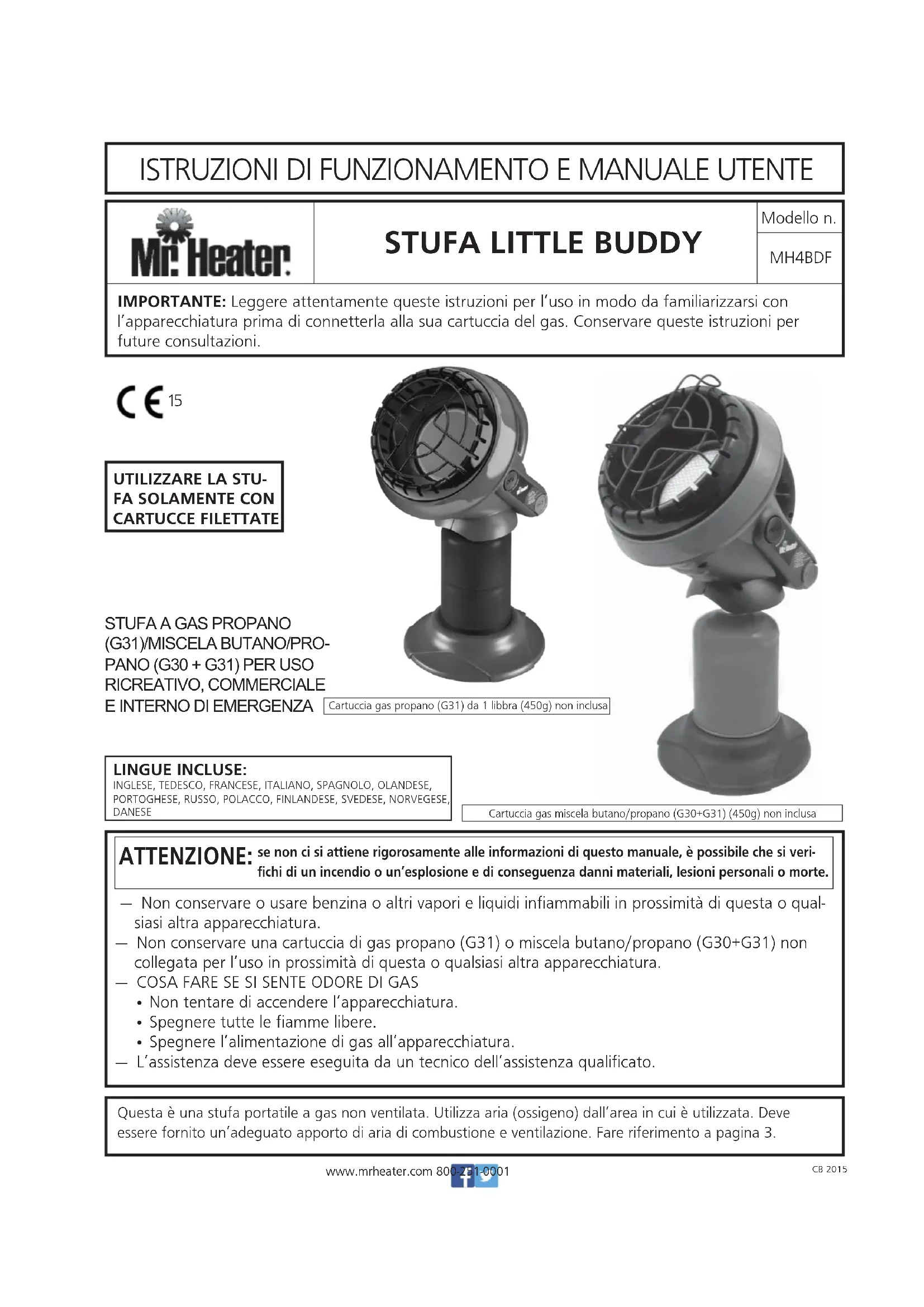 Mr. Heater, Inc. si riserva il diritto di effettuare modifiche in qualsiasi momento, senza alcun preavviso né obbligo, per quanto riguarda colori, specifiche, accessori, materiali e modelli. ATTENZIONE: UTILIZZARE SOLAMENTE PARTI DI RICAMBIO DEL PRODUTTORE. LÊUSO DI ALTRE PARTI PUš CAUSARE LESIONI O MORTE. LE PARTI DI RICAMBIO SONO DISPONIBILI SOLAMENTE DIRETTAMENTE DALLA FABBRICA E DEVONO ESSERE INSTALLATE DA UN TECNICO DELLÊASSISTENZA QUALIFICATO. INFORMAZIONI PER L’ORDINAZIONE DELLE PARTI: ACQUISTO: gli accessori possono essere acquistati sul sito www.mrheater.com e da rivenditori locali. PER INFORMAZIONI RIGUARDANTI VISITE DI ASSISTENZA: www.mrheater.com Il nostro orario di lavoro è 8.00-17.00 EST, da lunedì a venerdì. ˚ possibile parlare con un rappresentante tecnico attraverso il sito web: www.mrheater.com Includere il numero di modello, la data di acquisto e la descrizione del problema in tutte le comunicazioni. GARANZIA LIMITATA Mr. Heater, Inc. garantisce che le stufe e gli accessori sono prive di difetti di materiale e di fabbricazione per un periodo di 1 anno dalla data di acquisto. Mr. Heater, Inc. ripara o sostituisce questo prodotto gratuitamente se si è dimostrato difettoso durante il periodo di 1 anno, ed è restituito al venditore con prova di acquisto entro il periodo di garanzia. LEGGERE ATTENTAMENTE LE ISTRUZIONI: Leggere e seguire tutte le istruzioni. Conservare le istruzioni in un luogo sicuro per consultazioni future. Non consentire ad alcuna persona che non abbia letto queste istruzioni di assemblare, accendere, regolare, o mettere in funzione la stufa. MH4BDF Modello n. REGISTRAZIONE DEL PRODOTTO: Grazie per lÊacquisto. Eseguire lÊaccesso sul sito web http://www.egiregistration.com per registrare il proprio prodotto. STUFA LITTLE BUDDYwww.mrheater.com 800-251-0001CB 2015