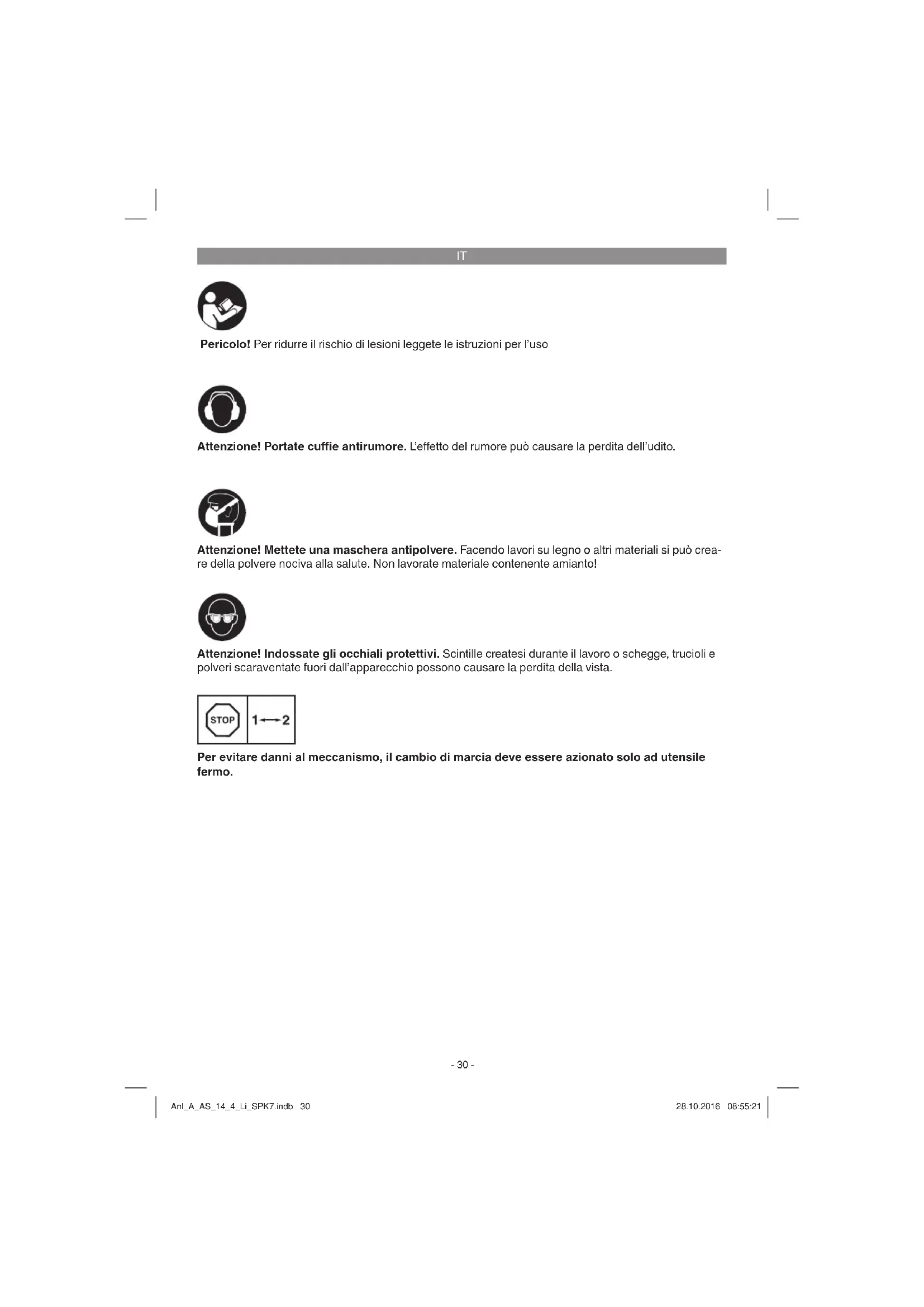 Pericolo! Per ridurre il rischio di lesioni leggete le istruzioni per l’uso Attenzione! Portate cuffi e antirumore. L’e ff etto del rumore può causare la perdita dell’udito. Attenzione! Indossate gli occhiali protettivi. Scintille createsi durante il lavoro o schegge, trucioli e polveri scaraventate fuori dall’apparecchio possono causare la perdita della vista. Attenzione! Mettete una maschera antipolvere. Facendo lavori su legno o altri materiali si può crea- re della polvere nociva alla salute. Non lavorate materiale contenente amianto! Per evitare danni al meccanismo, il cambio di marcia deve essere azionato solo ad utensile fermo. Anl_A_AS_14_4_Li_SPK7.indb 30Anl_A_AS_14_4_Li_SPK7.indb 30 28.10.2016 08:55:2128.10.2016 08:55:21IT
