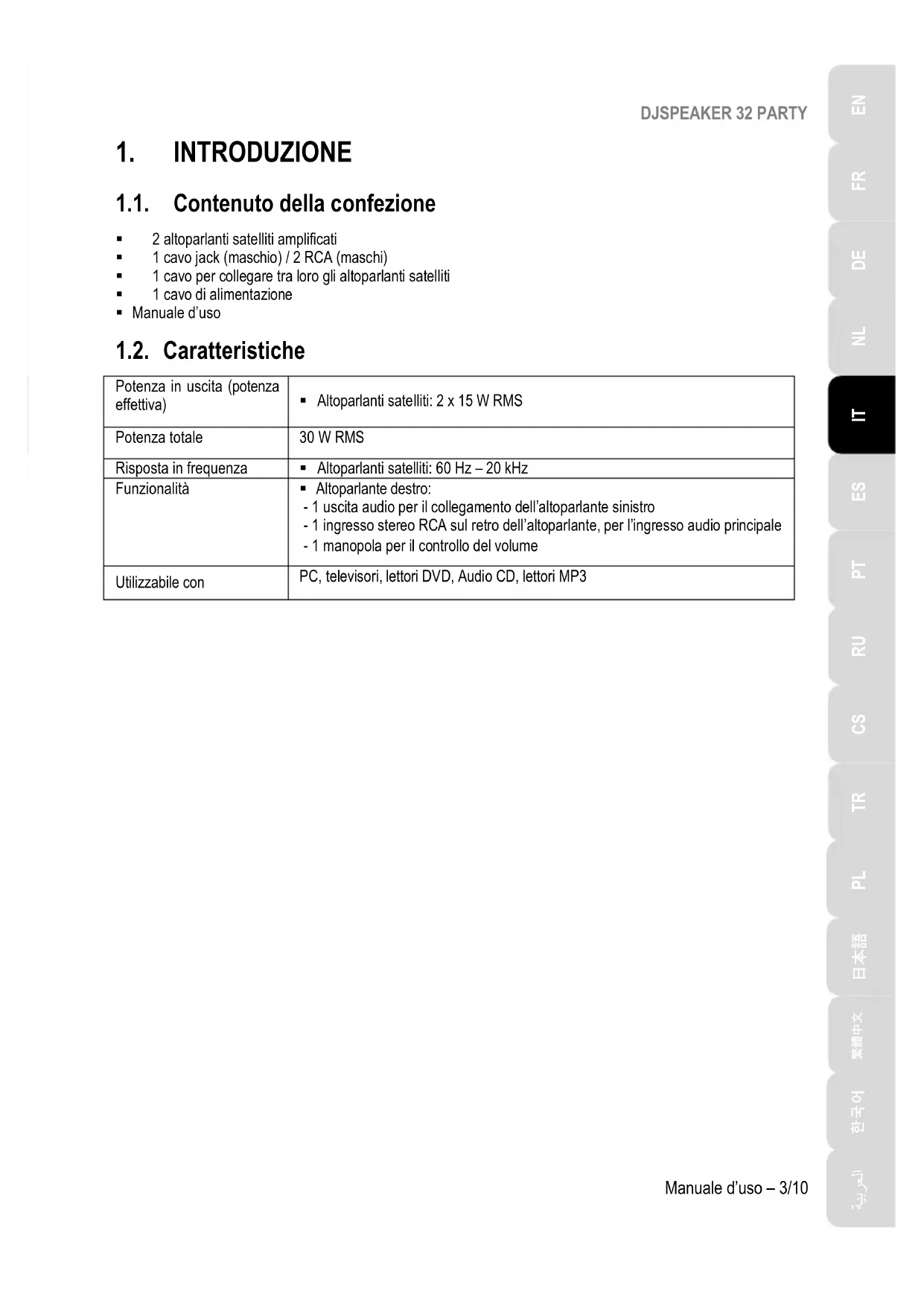 1.1. Contenuto della confezione 2 altoparlanti satelliti amplificati 1 cavo jack (maschio) / 2 RCA (maschi) 1 cavo per collegare tra loro gli altoparlanti satelliti 1 cavo di alimentazione Manuale d’uso 1.2. Caratteristiche Potenza in uscita (potenza effettiva) Altoparlanti satelliti: 2 x 15 W RMS Potenza totale 30 W RMS Risposta in frequenza Altoparlanti satelliti: 60 Hz – 20 kHz Funzionalità Altoparlante destro: - 1 uscita audio per il collegamento dell’altoparlante sinistro - 1 ingresso stereo RCA sul retro dell’altoparlante, per l’ingresso audio principale - 1 manopola per il controllo del volume Utilizzabile con PC, televisori, lettori DVD, Audio CD, lettori MP3DJSPEAKER 32 PARTY 4/10 – Manuale d’uso 1.3. Raccomandazioni - Colloca i tuoi altoparlanti su una superficie piana, per evitare il rischio di cadute. - Non aprire mai il tuo set di altoparlanti: rischieresti di danneggiarne le componentistiche interne. - Questo set di altoparlanti è destinato all'uso in un clima temperato. - Per prevenire qualsiasi rischio d’incendio o di scarica elettrica, tieni lontano i tuoi altoparlanti: - dalla pioggia, dall'umidità e da qualsiasi fluido (acqua, prodotti chimici o altro liquido), - da sorgenti di calore come termosifoni, stufe o altri apparecchi emettitori di calore (compresi gli amplificatori), - dalla luce solare diretta. - Non esporre il tuo set di altoparlanti a gocce o schizzi d'acqua. - Non poggiare mai alcun oggetto contenente liquidi (un bicchiere, un vaso…) sul tuo set di altoparlanti. - Se pensi di non dover utilizzare il tuo set di altoparlanti per un prolungato periodo di tempo, scollega il cavo di alimentazione. Per scollegare il cavo di alimentazione, afferra e tira la spina; non tirare mai il cavo stesso. - Assicurati che la presa di alimentazione del set di altoparlanti, collegata a una presa elettrica, sia sempre facilmente accessibile. - Scollega il set di altoparlanti prima di pulirlo. Utilizza un panno umido ed evita l'uso di detergenti con aerosol. - La presa di alimentazione del set di altoparlanti serve per spegnere la periferica e, pertanto, dovrà essere sempre facilmente accessibile. - I marchi sono presenti sul retro degli altoparlanti.