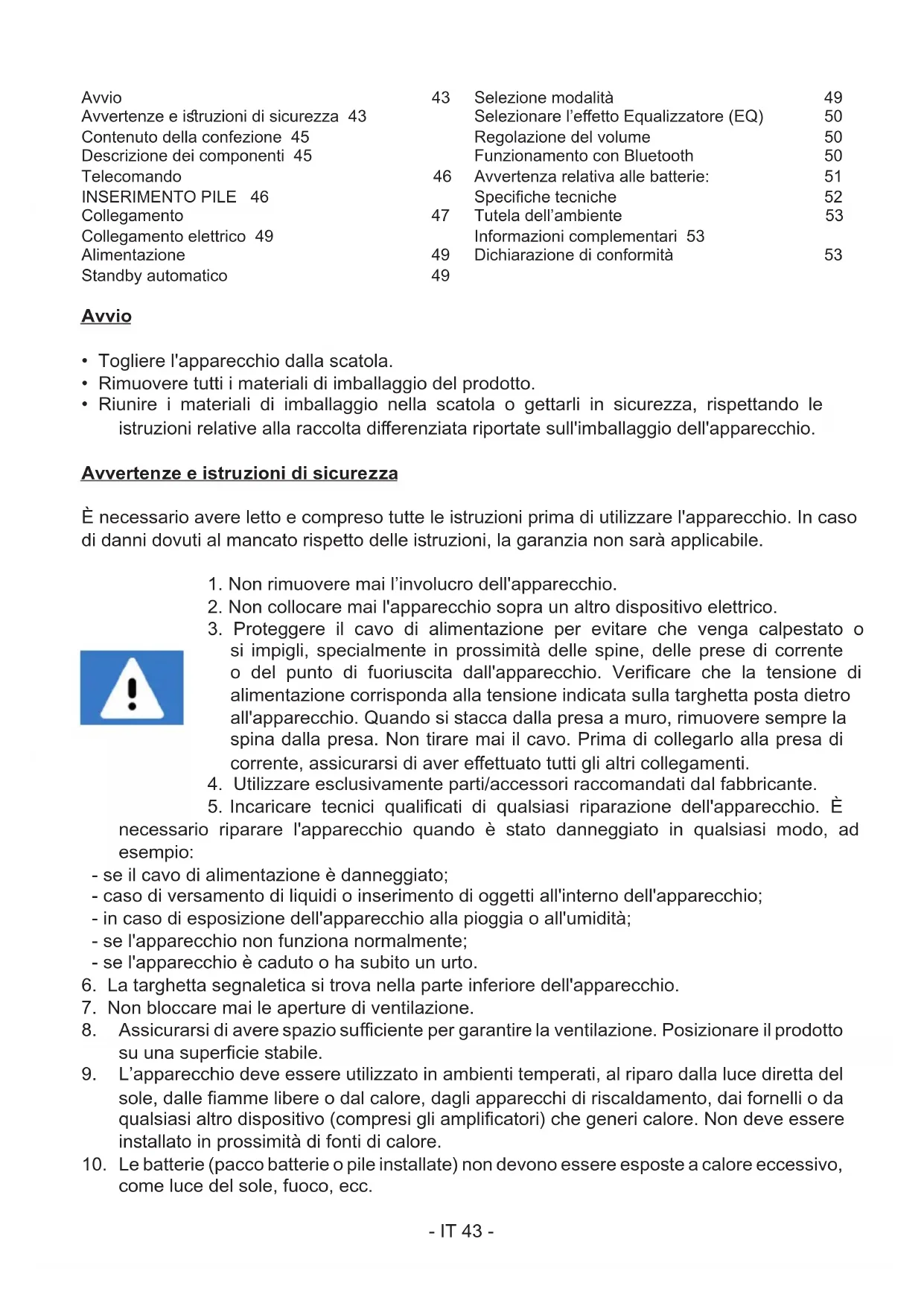 come luce del sole, fuoco, ecc. Avvio 43 Avvertenze e iruzioni di sicurezza 43 Contenuto della confezione 45 Descrizione dei componenti 45 Telecomando 46 INSERIMENTO PILE 46 Collegamento 47 Collegamento elettrico 49 Alimentazione 49 Standby automatico 49 Selezione modalità 49 Selezionare l’eetto Equalizzatore (EQ) 50 Regolazione del volume 50 Funzionamento con Bluetooth 50 Avvertenza relativa alle batterie: 51 Speciche tecniche 52 Tutela dell’ambiente 53 Informazioni complementari 53 Dichiarazione di conformità 53- IT 44 -