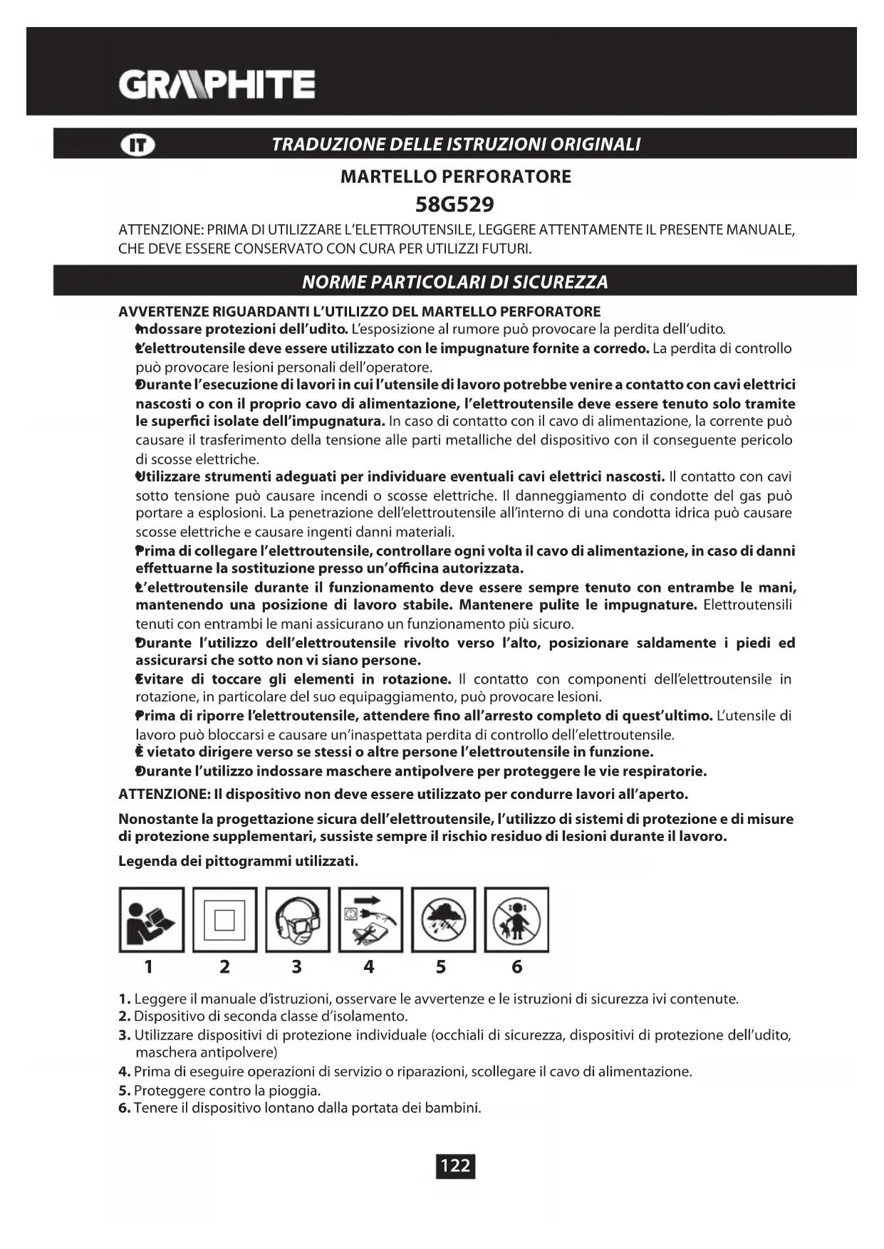 Durante l’utilizzo indossare maschere antipolvere per proteggere le vie respiratorie. ATTENZIONE: Il dispositivo non deve essere utilizzato per condurre lavori all’aperto. Nonostante la progettazione sicura dell’elettroutensile, l’utilizzo di sistemi di protezione e di misure di protezione supplementari, sussiste sempre il rischio residuo di lesioni durante il lavoro. Legenda dei pittogrammi utilizzati.