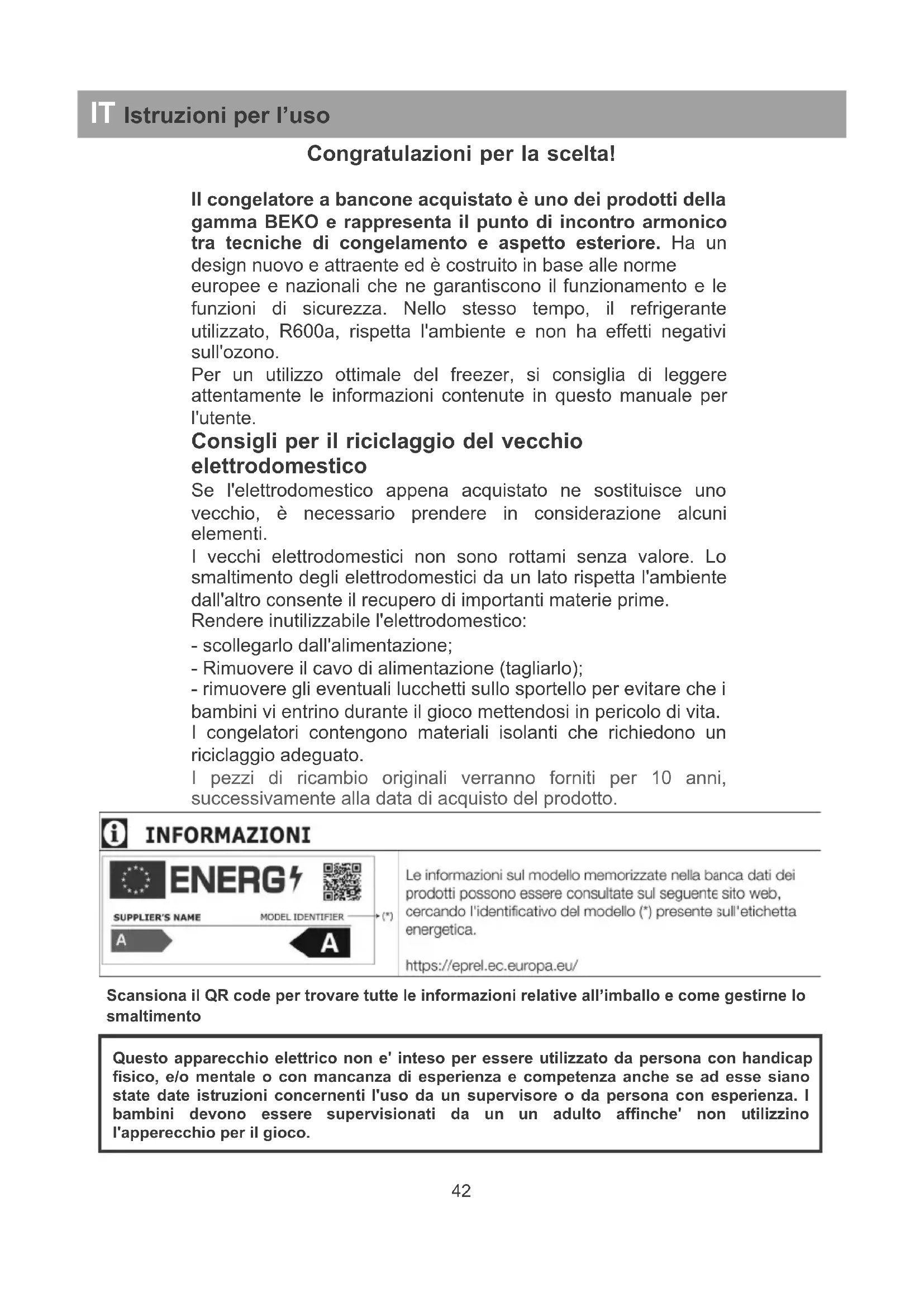 o ambiente y la salud humana debido a la presencia de ciertas sustancias.Congratulazioni per la scelta! Il congelatore a bancone acquistato è uno dei prodotti della gamma BEKO e rappresenta il punto di incontro armonico tra tecniche di congelamento e aspetto esteriore. Ha un design nuovo e attraente ed è costruito in base alle norme europee e nazionali che ne garantiscono il funzionamento e le funzioni di sicurezza. Nello stesso tempo, il refrigerante utilizzato, R600a, rispetta l'ambiente e non ha effetti negativi sull'ozono. Per un utilizzo ottimale del freezer, si consiglia di leggere attentamente le informazioni contenute in questo manuale per l'utente. Consigli per il riciclaggio del vecchio elettrodomestico Se l'elettrodomestico appena acquistato ne sostituisce uno vecchio, è necessario prendere in considerazione alcuni elementi. I vecchi elettrodomestici non sono rottami senza valore. Lo smaltimento degli elettrodomestici da un lato rispetta l'ambiente dall'altro consente il recupero di importanti materie prime. Rendere inutilizzabile l'elettrodomestico: - scollegarlo dall'alimentazione; - Rimuovere il cavo di alimentazione (tagliarlo); - rimuovere gli eventuali lucchetti sullo sportello per evitare che i bambini vi entrino durante il gioco mettendosi in pericolo di vita. I congelatori contengono materiali isolanti che richiedono un riciclaggio adeguato. I pezzi di ricambio originali verranno forniti per 10 anni, successivamente alla data di acquisto del prodotto. IT Istruzioni per l’uso