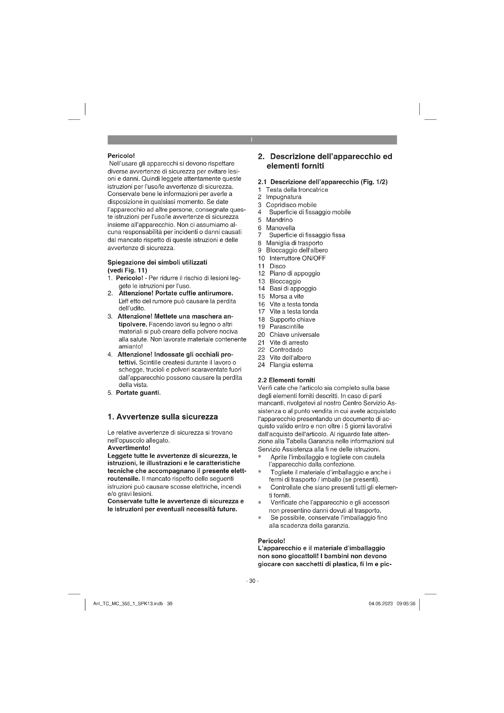Se possibile, conservate l’imballaggio fino alla scadenza della garanzia. Pericolo! L’apparecchio e il materiale d’imballaggio non sono giocattoli! I bambini non devono giocare con sacchetti di plastica, fi lm e pic- Anl_TC_MC_355_1_SPK13.indb 30Anl_TC_MC_355_1_SPK13.indb 30 04.05.2023 09:05:3604.05.2023 09:05:36I