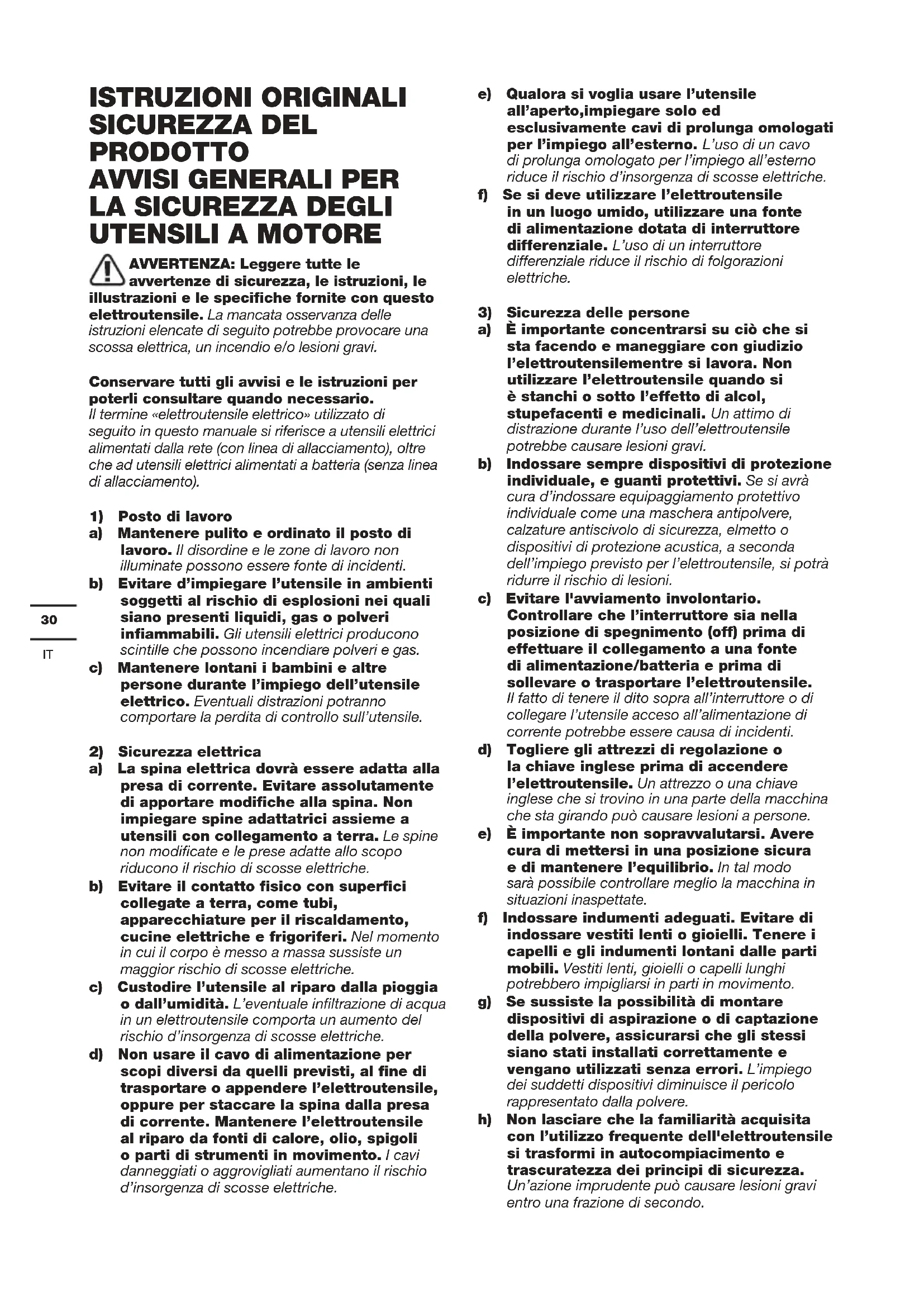 AVVERTENZA: Leggere tutte le avvertenze di sicurezza, le istruzioni, le illustrazioni e le specifiche fornite con questo elettroutensile. La mancata osservanza delle istruzioni elencate di seguito potrebbe provocare una scossa elettrica, un incendio e/o lesioni gravi. Conservare tutti gli avvisi e le istruzioni per poterli consultare quando necessario. Il termine «elettroutensile elettrico» utilizzato di seguito in questo manuale si riferisce a utensili elettrici alimentati dalla rete (con linea di allacciamento), oltre che ad utensili elettrici alimentati a batteria (senza linea di allacciamento).