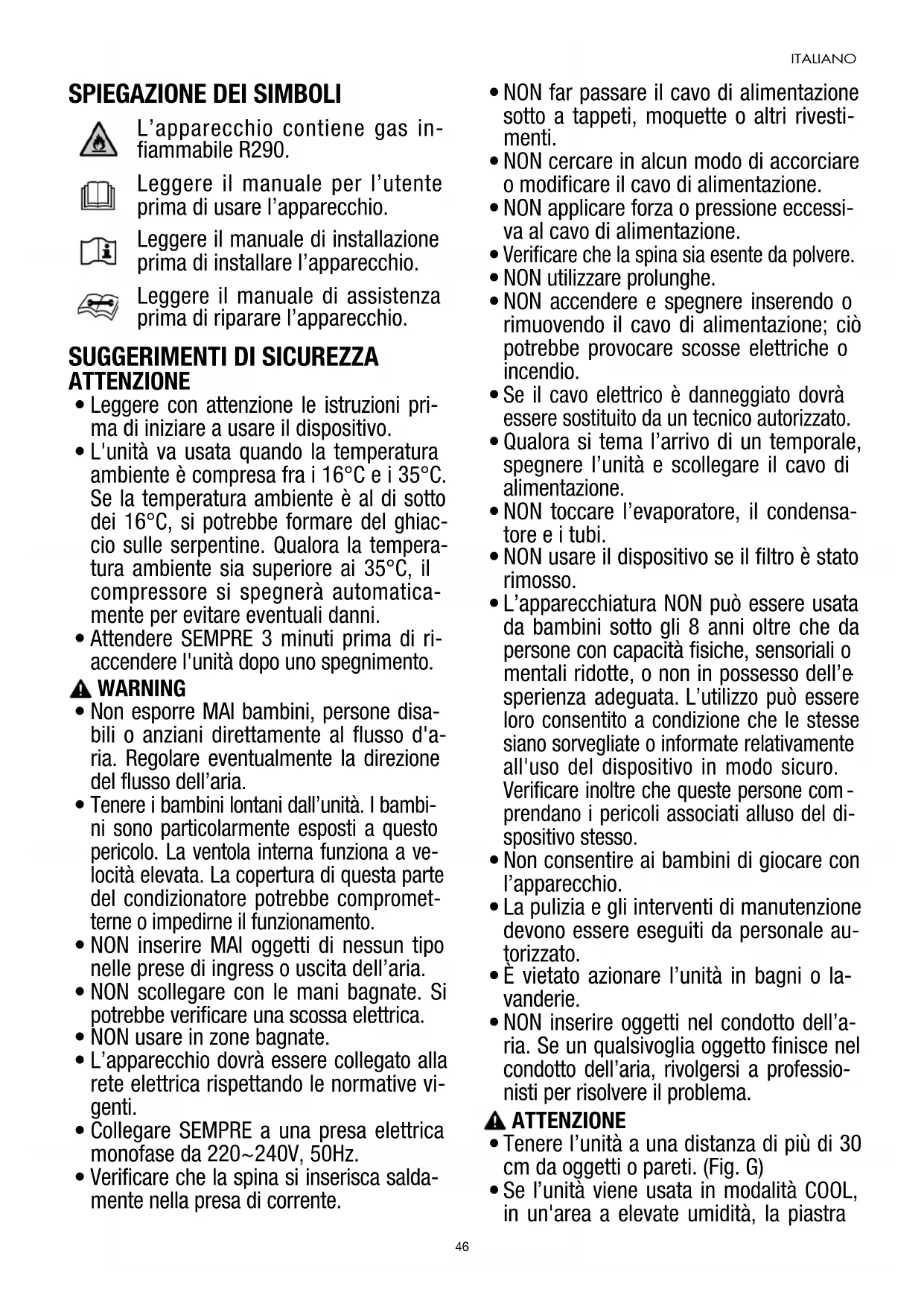 | Manutenzione | Filtri da pulire regolarmente, serbatoio dell'acqua da svuotare se usato in modalit e0 deumidificazione. |