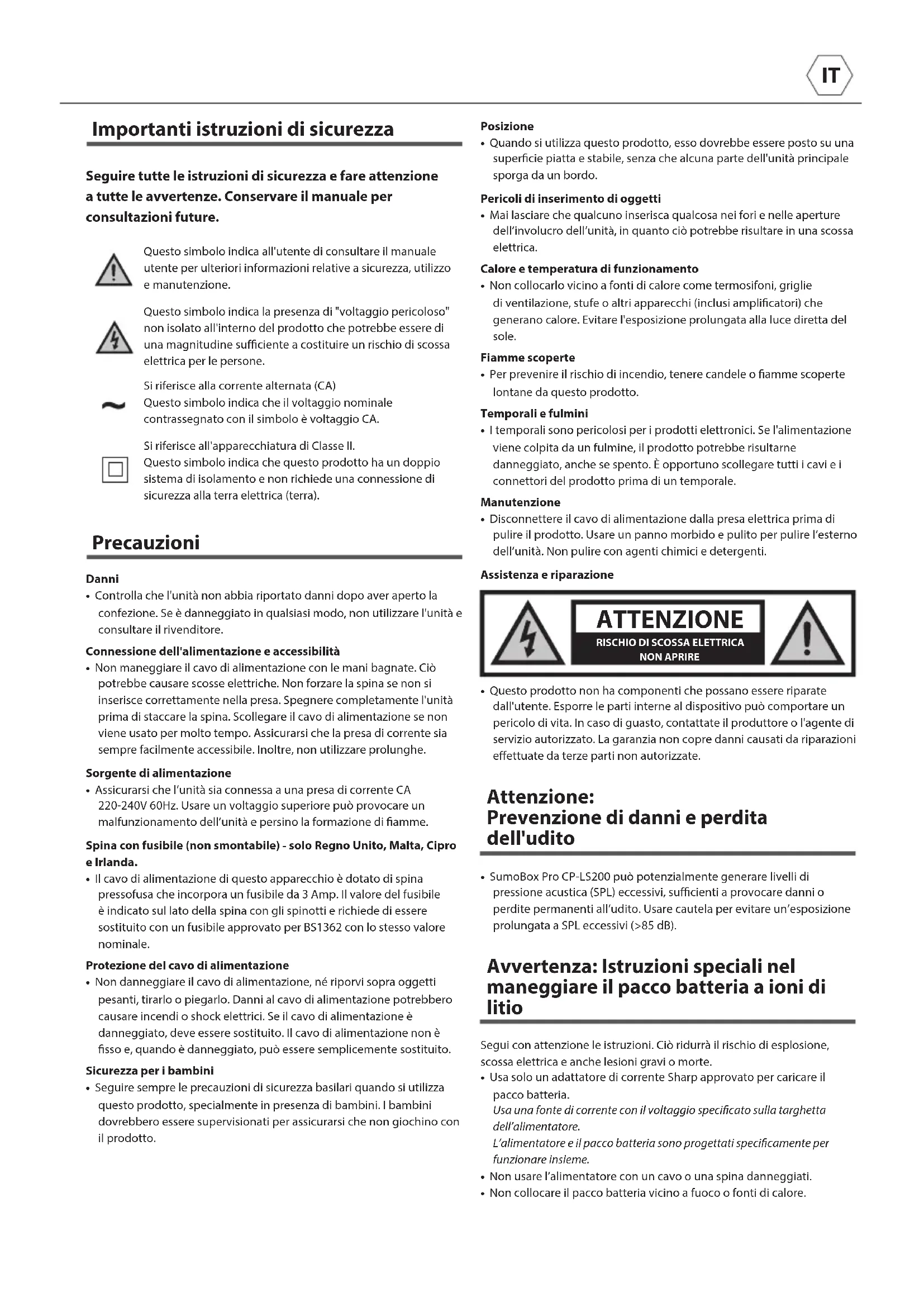 - SumoBox Pro CP-LS200 può potenzialmente generare livelli di pressione acustica (SPL) eccessivi, sucienti a provocare danni o perdite permanenti all’udito. Usare cautela per evitare un’esposizione prolungata a SPL eccessivi (>85 dB). Avvertenza: Istruzioni speciali nel maneggiare il pacco batteria a ioni di litio Segui con attenzione le istruzioni. Ciò ridurrà il rischio di esplosione, scossa elettrica e anche lesioni gravi o morte.• Usa solo un adattatore di corrente Sharp approvato per caricare il pacco batteria.Usa una fonte di corrente con il voltaggio specicato sulla targhetta dell’alimentatore.L’alimentatore e il pacco batteria sono progettati specicamente per funzionare insieme.• Non usare l’alimentatore con un cavo o una spina danneggiati.• Non collocare il pacco batteria vicino a fuoco o fonti di calore. CAUTION
