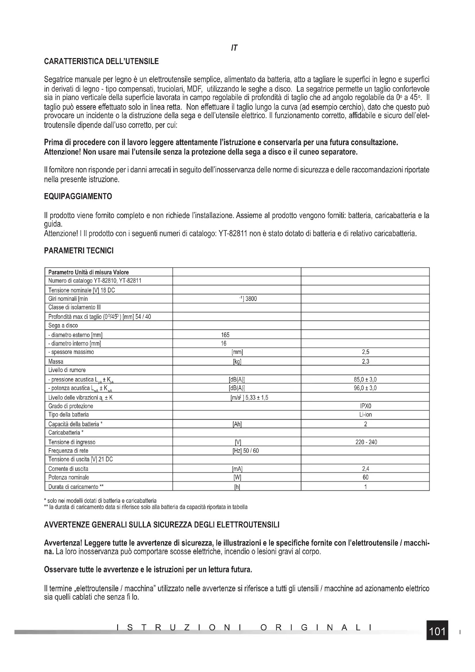 . Il taglio può essere eff ettuato solo in linea retta. Non eff ettuare il taglio lungo la curva (ad esempio cerchio), dato che questo può provocare un incidente o la distruzione della sega e dell’utensile elettrico. Il funzionamento corretto, affi dabile e sicuro dell’elet- troutensile dipende dall’uso corretto, per cui: Prima di procedere con il lavoro leggere attentamente l’istruzione e conservarla per una futura consultazione. Attenzione! Non usare mai l’utensile senza la protezione della sega a disco e il cuneo separatore. Il fornitore non risponde per i danni arrecati in seguito dell’inosservanza delle norme di sicurezza e delle raccomandazioni riportate nella presente istruzione. EQUIPAGGIAMENTO Il prodotto viene fornito completo e non richiede l’installazione. Assieme al prodotto vengono forniti: batteria, caricabatteria e la guida. Attenzione! l Il prodotto con i seguenti numeri di catalogo: YT-82811 non è stato dotato di batteria e di relativo caricabatteria. PARAMETRI TECNICI Parametro Unità di misura Valore Numero di catalogo YT-82810, YT-82811 Tensione nominale [V] 18 DC Giri nominali [min
