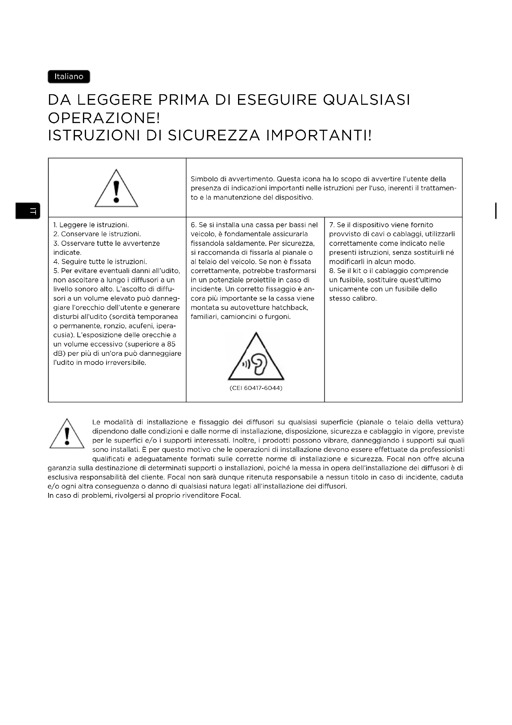 un fusibile, sostituire quest’ultimo unicamente con un fusibile dello stesso calibro. (CEI 60417-6044) Le modalità di installazione e fissaggio dei diffusori su qualsiasi superficie (pianale o telaio della vettura) dipendono dalle condizioni e dalle norme di installazione, disposizione, sicurezza e cablaggio in vigore, previste per le superfici e/o i supporti interessati. Inoltre, i prodotti possono vibrare, danneggiando i supporti sui quali sono installati. È per questo motivo che le operazioni di installazione devono essere effettuate da professionisti qualificati e adeguatamente formati sulle corrette norme di installazione e sicurezza. Focal non offre alcuna garanzia sulla destinazione di determinati supporti o installazioni, poiché la messa in opera dell’installazione dei diffusori è di esclusiva responsabilità del cliente. Focal non sarà dunque ritenuta responsabile a nessun titolo in caso di incidente, caduta e/o ogni altra conseguenza o danno di qualsiasi natura legati all’installazione dei diffusori. In caso di problemi, rivolgersi al proprio rivenditore Focal.IT Per convalidare la garanzia Focal-JMlab, è ora possibile registrare il proprio prodotto online su: www.focal.com/garantie Nell’ottica di un miglioramento costante o per tenere conto di evoluzioni legali o normative, FOCAL JMLab si riserva il diritto di modificare le specifiche tecniche dei suoi prodotti senza preavviso. In questo caso, le immagini proposte sono unicamente destinate all’illustrazione delle istruzioni, e potrebbero lievemente differire dal prodotto venduto. La ringraziamo per avere acquistato un prodotto Focal. Le diamo il benvenuto nel nostro l’universo: quello dell’Alta fedeltà. Innovazione, tradizione, eccellenza e piacere sono i nostri valori. E il nostro obiettivo è uno solo: offrire agli ascoltatori un suono puro, fedele e ricco. Per sfruttare al meglio tutte le prestazioni del suo prodotto le consigliamo di leggere le istruzioni di questo libretto e conservarlo con cura per poterlo consultare anche in un secondo tempo. RACCOMANDAZIONI IMPORTANTI In primo luogo, verificare lo spazio disponibile per l’installazione degli altoparlanti (fare riferimento agli schemi riportati sulla confezione) e procedere ai tagli necessari. In caso di montaggio nel vano originario, verificare che vi sia spazio sufficiente fra l’altoparlante e la griglia protettiva.