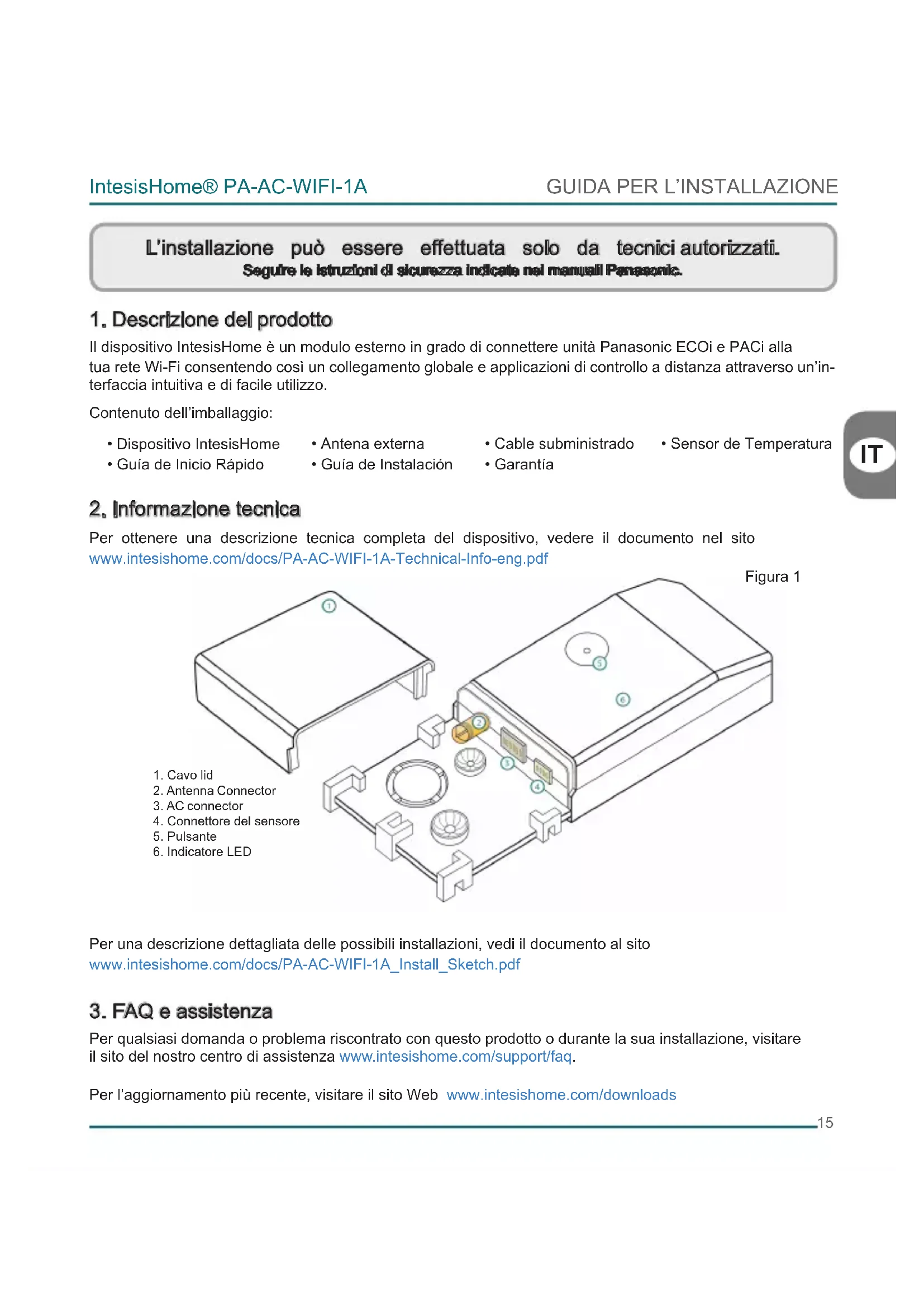 Il dispositivo IntesisHome è un modulo esterno in grado di connettere unità Panasonic ECOi e PACi alla tua rete Wi-Fi consentendo così un collegamento globale e applicazioni di controllo a distanza attraverso un’in- terfaccia intuitiva e di facile utilizzo. Contenuto dell’imballaggio: Per ottenere una descrizione tecnica completa del dispositivo, vedere il documento nel sito www.intesishome.com/docs/PA-AC-WIFI-1A-Technical-Info-eng.pdf Per una descrizione dettagliata delle possibili installazioni, vedi il documento al sito www.intesishome.com/docs/PA-AC-WIFI-1A_Install_Sketch.pdf Per qualsiasi domanda o problema riscontrato con questo prodotto o durante la sua installazione, visitare il sito del nostro centro di assistenza www.intesishome.com/support/faq. Per l’aggiornamento più recente, visitare il sito Web www.intesishome.com/downloads L’installazione può essere effettuata solo da tecnici autorizzati. Seguire le istruzioni di sicurezza indicate nei manuali Panasonic.