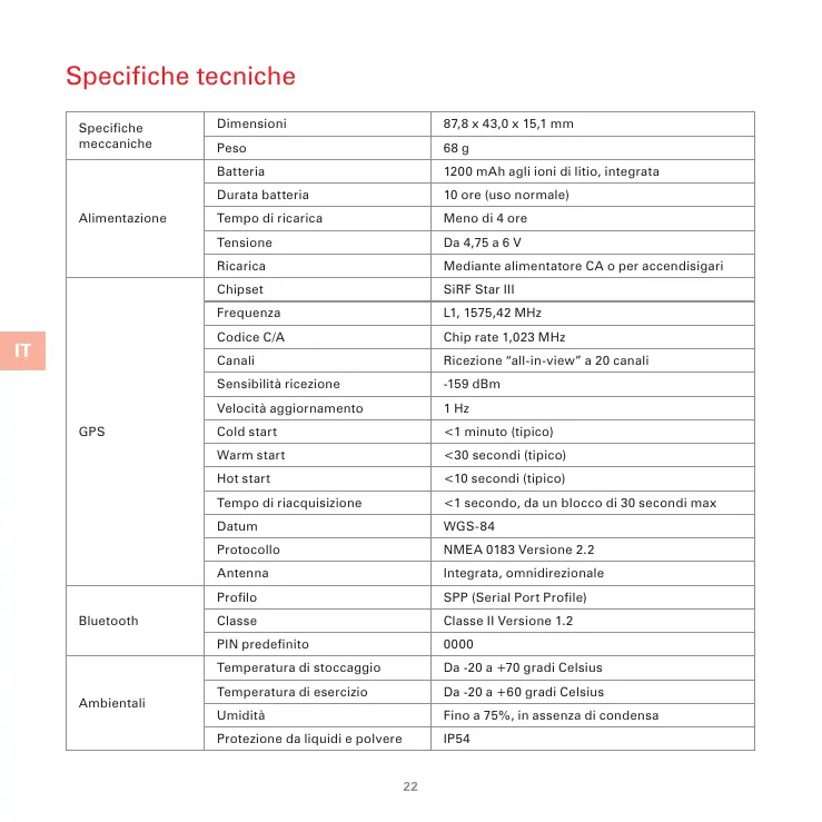 GPS Bluetooth Ambientali Dimensioni 87,8 x 43,0 x 15,1 mm Peso 68 g Batteria 1200 mAh agli ioni di litio, integrata Durata batteria 10 ore (uso normale) Tempo di ricarica Meno di 4 ore Tensione Da 4,75 a 6 V Ricarica Mediante alimentatore CA o per accendisigari Chipset SiRF Star III Frequenza L1, 1575,42 MHz Codice C/A Chip rate 1,023 MHz Canali Ricezione “all-in-view” a 20 canali Sensibilità ricezione -159 dBm Velocità aggiornamento 1 Hz Cold start <1 minuto (tipico) Warm start <30 secondi (tipico) Hot start <10 secondi (tipico) Tempo di riacquisizione <1 secondo, da un blocco di 30 secondi max Datum WGS-84 Protocollo NMEA 0183 Versione 2.2 Antenna Integrata, omnidirezionale Profilo SPP (Serial Port Profile) Classe Classe II Versione 1.2 PIN predefinito