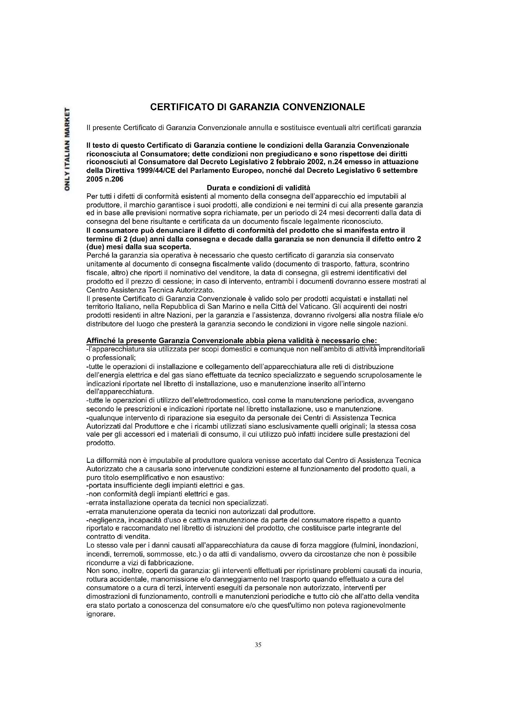 II presente Certificato di Garanzia Convenzionale annulla e sostituisce eventuali altri certificati garanzia Il testo di questo Certificato di Garanzia contiene le condizioni della Garanzia Convenzionale riconosciuta al Consumatore; dette condizioni non pregiudicano e sono rispettose dei diritti riconosciuti al Consumatore dal Decreto Legislativo 2 febbraio 2002, n.24 emesso in attuazione della Direttiva 1999/44/CE del Parlamento Europeo, nonché dal Decreto Legislativo 6 settembre 2005 n.206 Durata e condizioni di validità Per tutti i difetti di conformità esistenti al momento della consegna dell’apparecchio ed imputabili al produttore, il marchio garantisce i suoi prodotti, alle condizioni e nei termini di cui alla presente garanzia ed in base alle previsioni normative sopra richiamate, per un periodo di 24 mesi decorrenti dalla data di consegna del bene risultante e certificata da un documento fiscale legalmente riconosciuto. Il consumatore può denunciare il difetto di conformità del prodotto che si manifesta entro il termine di 2 (due) anni dalla consegna e decade dalla garanzia se non denuncia il difetto entro 2 (due) mesi dalla sua scoperta. Perché la garanzia sia operativa è necessario che questo certificato di garanzia sia conservato unitamente al documento di consegna fiscalmente valido (documento di trasporto, fattura, scontrino fiscale, altro) che riporti il nominativo del venditore, la data di consegna, gli estremi identificativi del prodotto ed il prezzo di cessione; in caso di intervento, entrambi i documenti dovranno essere mostrati al Centro Assistenza Tecnica Autorizzato. Il presente Certificato di Garanzia Convenzionale è valido solo per prodotti acquistati e installati nel territorio Italiano, nella Repubblica di San Marino e nella Città del Vaticano. Gli acquirenti dei nostri prodotti residenti in altre Nazioni, per la garanzia e l’assistenza, dovranno rivolgersi alla nostra filiale e/o distributore del luogo che presterà la garanzia secondo le condizioni in vigore nelle singole nazioni. Affinché la presente Garanzia Convenzionale abbia piena validità è necessario che: -l’apparecchiatura sia utilizzata per scopi domestici e comunque non nell’ambito di attività imprenditoriali o professionali; -tutte le operazioni di installazione e collegamento dell’apparecchiatura alle reti di distribuzione dell’energia elettrica e del gas siano effettuate da tecnico specializzato e seguendo scrupolosamente le indicazioni riportate nel libretto di installazione, uso e manutenzione inserito all’interno dell'apparecchiatura. -tutte le operazioni di utilizzo dell’elettrodomestico, così come la manutenzione periodica, avvengano secondo le prescrizioni e indicazioni riportate nel libretto installazione, uso e manutenzione. -qualunque intervento di riparazione sia eseguito da personale dei Centri di Assistenza Tecnica Autorizzati dal Produttore e che i ricambi utilizzati siano esclusivamente quelli originali; la stessa cosa vale per gli accessori ed i materiali di consumo, il cui utilizzo può infatti incidere sulle prestazioni del prodotto. La difformità non è imputabile al produttore qualora venisse accertato dal Centro di Assistenza Tecnica Autorizzato che a causarla sono intervenute condizioni esterne al funzionamento del prodotto quali, a puro titolo esemplificativo e non esaustivo: -portata insufficiente degli impianti elettrici e gas. -non conformità degli impianti elettrici e gas. -errata installazione operata da tecnici non specializzati. -errata manutenzione operata da tecnici non autorizzati dal produttore. -negligenza, incapacità d'uso e cattiva manutenzione da parte del consumatore rispetto a quanto riportato e raccomandato nel libretto di istruzioni del prodotto, che costituisce parte integrante del contratto di vendita. Lo stesso vale per i danni causati all'apparecchiatura da cause di forza maggiore (fulmini, inondazioni, incendi, terremoti, sommosse, etc.) o da atti di vandalismo, ovvero da circostanze che non è possibile ricondurre a vizi di fabbricazione. Non sono, inoltre, coperti da garanzia: gli interventi effettuati per ripristinare problemi causati da incuria, rottura accidentale, manomissione e/o danneggiamento nel trasporto quando effettuato a cura del consumatore o a cura di terzi, interventi eseguiti da personale non autorizzato, interventi per dimostrazioni di funzionamento, controlli e manutenzioni periodiche e tutto ciò che all'atto della vendita era stato portato a conoscenza del consumatore e/o che quest'ultimo non poteva ragionevolmente ignorare.36 Oggetto della Garanzia Oalora nel periodo di durata della garanzia sia accertato e riconosciuto un difetto di conformità del bene imputabile ad azione od omissione del produttore, il consumatore potrà richiedere di riparare il prodotto o di sostituirlo senza spese in entrambi i casi. Qualora il rimedio prescelto sia oggettivamente impossibile o, a giudizio del produttore, appaia eccessivamente oneroso rispetto all'altro, quest'ultimo valuterà dapprima l'opportunità di riparare il bene, se possibile, qualora il costo delle riparazioni non risultasse sproporzionato rispetto al valore del prodotto. Qualora il costo della riparazione risultasse sproporzionato, il produttore provvederà a sostituire il bene. Gli eventuali interventi di riparazione o eventuale sostituzione del prodotto, non estendono la durata della garanzia originaria che decorre sempre dalla data di acquisto del primo bene acquistato. Cosa non copre la Garanzia Non sono coperti da garanzia tutti i componenti che dovessero manifestare un difetto di conformità a causa di: -usura, negligenza, trascuratezza d’uso e cattiva manutenzione da parte del consumatore a causa del mancato rispetto di quanto riportato e raccomandato nei libretti installazione uso e manutenzione del prodotto. -danni da trasporto, ovvero di circostanze che, comunque, non possono farsi risalire ad azione od omissione del produttore. -errata