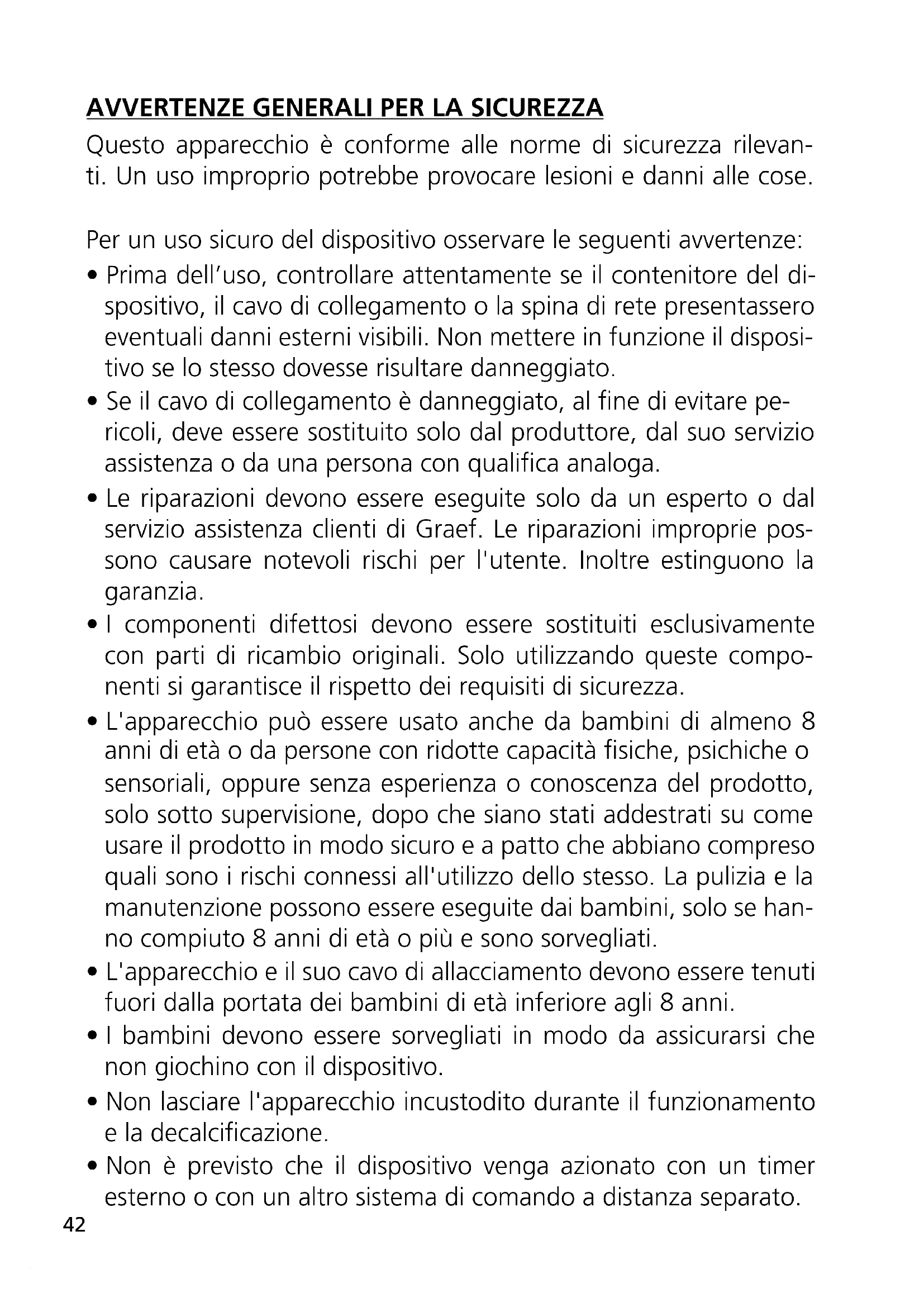 - Le riparazioni devono essere eseguite solo da un esperto o dal servizio assistenza clienti di Graef. Le riparazioni improprie pos- sono causare notevoli rischi per l'utente. Inoltre estinguono la garanzia.