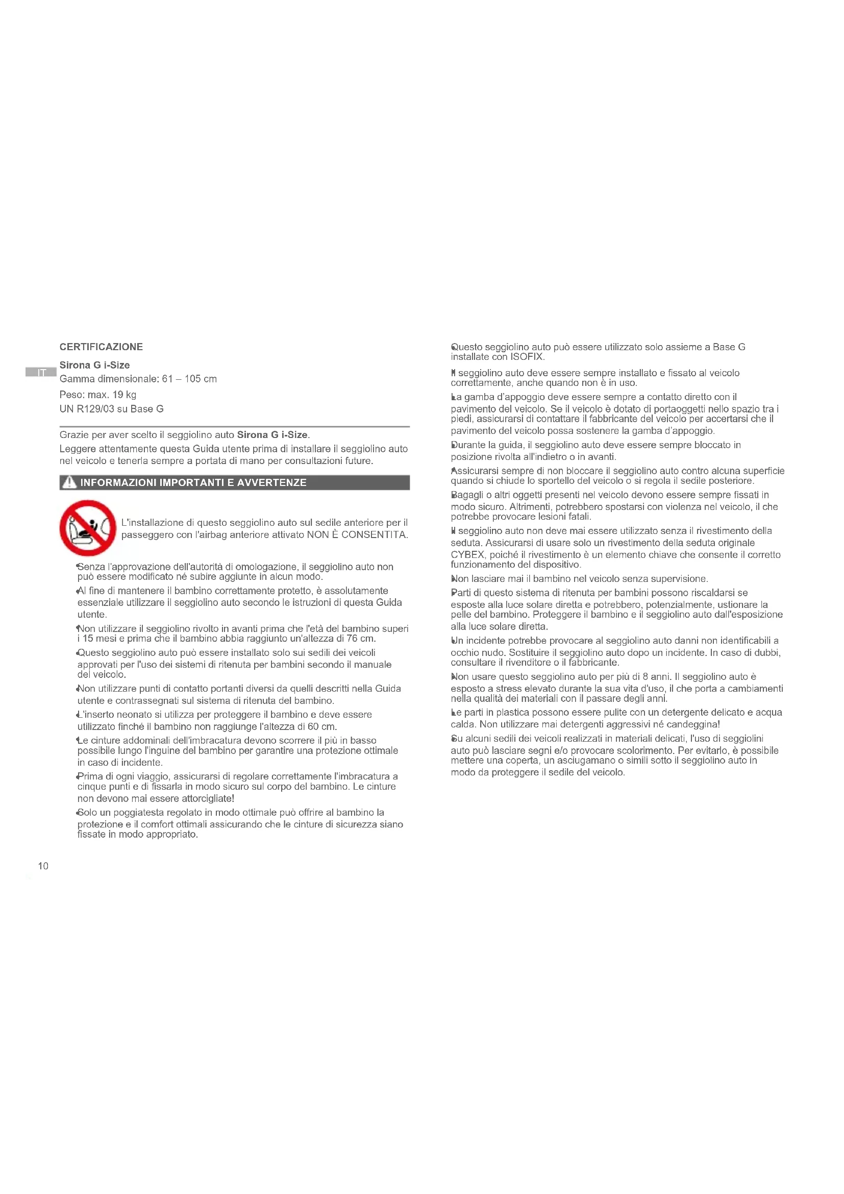 CERTIFICAZIONE Sirona G i-Size Gamma dimensionale: 61 – 105 cm Peso: max. 19 kg UN R129/03 su Base G Grazie per aver scelto il seggiolino auto Sirona G i-Size. Leggere attentamente questa Guida utente prima di installare il seggiolino auto nel veicolo e tenerla sempre a portata di mano per consultazioni future.