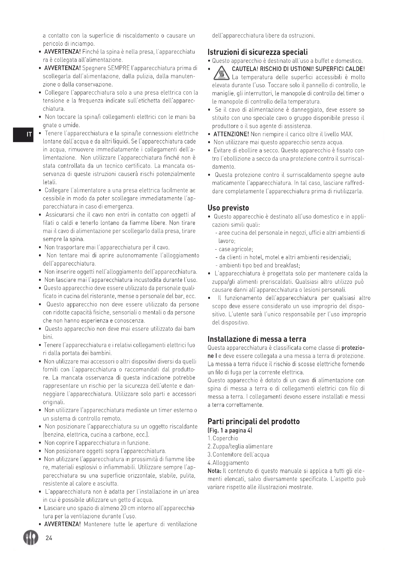 - L’apparecchiatura è progettata solo per mantenere calda la zuppa/gli alimenti preriscaldati. Qualsiasi altro utilizzo può causare danni all’apparecchiatura o lesioni personali.