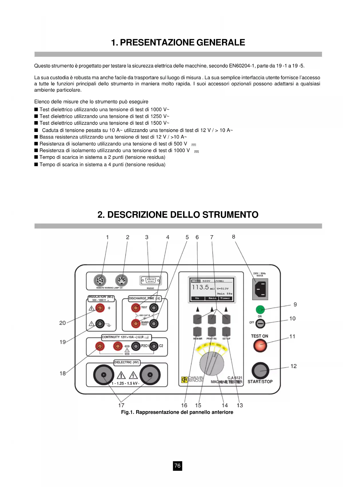 - ■ Questo strumento deve essere collegato a una presa di rete con morsetto di terra di protezione. ■ I morsetti di misura ISOLAMENTO, CONTINUITA’ O E DIELETTRICO devono essere collegati solo a circuiti non in tensione. ■ In caso di fusibile bruciato all’interno dello strumento, seguire le istruzioni di sostituzione in questo manuale! ■ La procedura di riparazione o taratura può essere eseguita soltanto da una persona competente autorizzata! ■ MACHINE TESTER C.A 6121 può essere utilizzato soltanto da una persona esperta, che abbia familiarità con operazioni in tensione pericolose! ■ Utilizzare accessori di collegamento con categoria di sovratensione e tensione di servizio superiori o uguali a quelle dei circuiti sui quali si effettuano le misure. Usare esclusivamente accessori conformi alle norme di sicurezza (EN61010-031). ■ Isolamento Il morsetto è messo a terra, collegarlo al polo messo a terra dell’oggetto testato! ■ Continuità Leggere le istruzioni per la sostituzione di un fusibile bruciato. ■ Dielettrica Spegnere immediatamente lo strumento in caso il led rosso di avvertimento (pos.11., fig.1.) non si accenda dopo l’avviamentp del generatore AT. ■ Definizioni Attenzione, pericolo di scossa elettrica Morsetto di terra L’ingresso di alimentazione ha una categoria di sovratensione II e deve essere collegato a impianti elettrici fissi, domestici e simili ( cf. IEC 664-1). I morsetti di misura del TEMPO SI SCARICA hanno una categoria di sovratensione III e soddisfano le più severe esigenze di affidabilità e versatilità per l’ uso permanente in impianti industriali fissi (cf. IEC 664-1).75 GARANZIA La nostra garanzia è valida fino a 12 mesi dopo la data in cui si rende disponibile l’apparecchiatura (estratto dalle nostre Condizioni Generali di Vendita, disponibili a richiesta). SOMMARIO 1. PRESENTAZIONE GENERALE p. 76