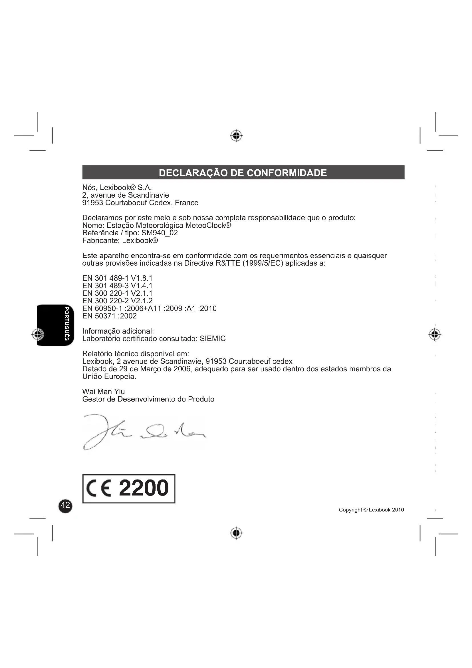 Nós, Lexibook® S.A. 2, avenue de Scandinavie 91953 Courtaboeuf Cedex, France Declaramos por este meio e sob nossa completa responsabilidade que o produto: Nome: Estação Meteorológica MeteoClock® Referência / tipo: SM940_02 Fabricante: Lexibook® Este aparelho encontra-se em conformidade com os requerimentos essenciais e quaisquer outras provisões indicadas na Directiva R&TTE (1999/5/EC) aplicadas a: EN 301 489-1 V1.8.1 EN 301 489-3 V1.4.1 EN 300 220-1 V2.1.1 EN 300 220-2 V2.1.2 EN 60950-1 :2006+A11 :2009 :A1 :2010 EN 50371 :2002 Informação adicional: Laboratório certicado consultado: SIEMIC Relatório técnico disponível em: Lexibook, 2 avenue de Scandinavie, 91953 Courtaboeuf cedex Datado de 29 de Março de 2006, adequado para ser usado dentro dos estados membros da União Europeia. Wai Man Yiu Gestor de Desenvolvimento do Produto Congratulazioni per l’acquisto della stazione meteo MeteoClock® Silver SM940_02. Si raccomanda di leggere e capire bene il manuale di istruzioni per usare al meglio la praticità e le funzioni offerte da questo prodotto. Cos’è esattamente una Stazione Meteo? Le stazioni digitali Lexibook non solo misurano lo scorrere del tempo grazie al loro orologio incorporato, ma indicano anche le condizioni meteorologiche presenti e in arrivo. Il MeteoClock® Silver SM940_02 include le seguenti funzioni: - Termometro: La temperatura appare in tempo reale e arrotondata al decimo di grado Celsius. Grazie al suo sensore senza li, la stazione può rilevare a distanza la temperatura esterna o quella di un altro locale. - Igrometro: L’igrometria interna ed esterna è espressa in percentuale di umidità della temperatura ambiente. La “Zona di comfort” del corpo umano è tra il 35 e il 65% di igrometria ad una temperatura compresa tra 18 e 24oC. - Barometro: La stazione monitora anche la pressione atmosferica in tempo reale. Mostra le previsioni del tempo per mezzo di icone animate (sole, nuvole, pioggia...) per le 12-24 ore successive. Far riferimento alla gura A Descrizione unità principale
