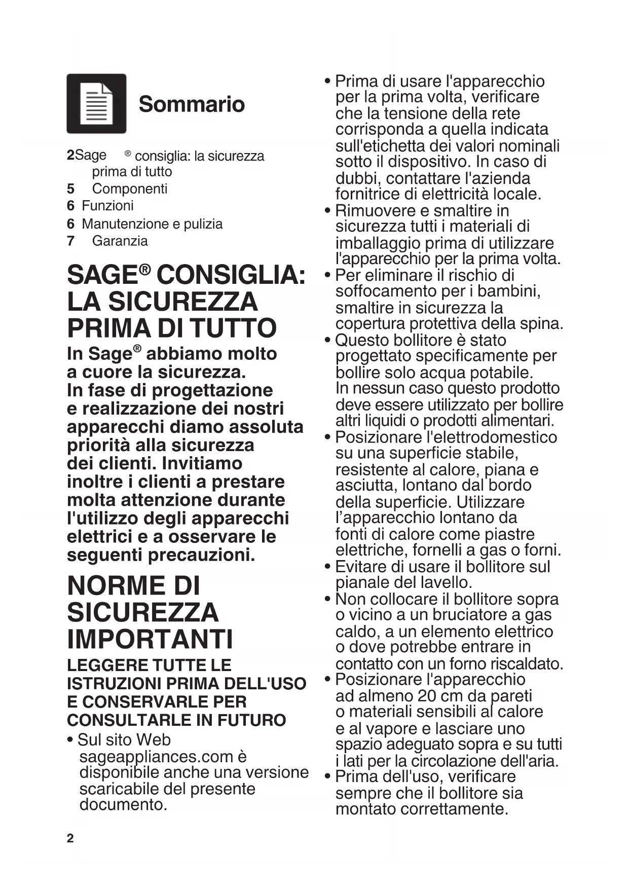 - Prima dell'uso, vericare sempre che il bollitore sia montato correttamente. 2 Sage consiglia: la sicurezza prima di tutto5 Componenti6 Funzioni6 Manutenzione e pulizia7 Garanzia Sommario SAGE