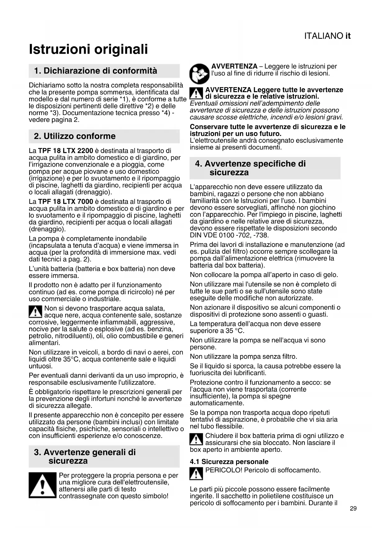 L'apparecchio non deve essere utilizzato da bambini, ragazzi o persone che non abbiano familiarità con le Istruzioni per l'uso. I bambini devono essere sorvegliati, affinché non giochino con l'apparecchio. Per l'impiego in piscine, laghatti da giardino e nelle relative aree di sicurezza, devono essere rispetto le disposizioni secondo DIN VDE 0100 -702, -738.