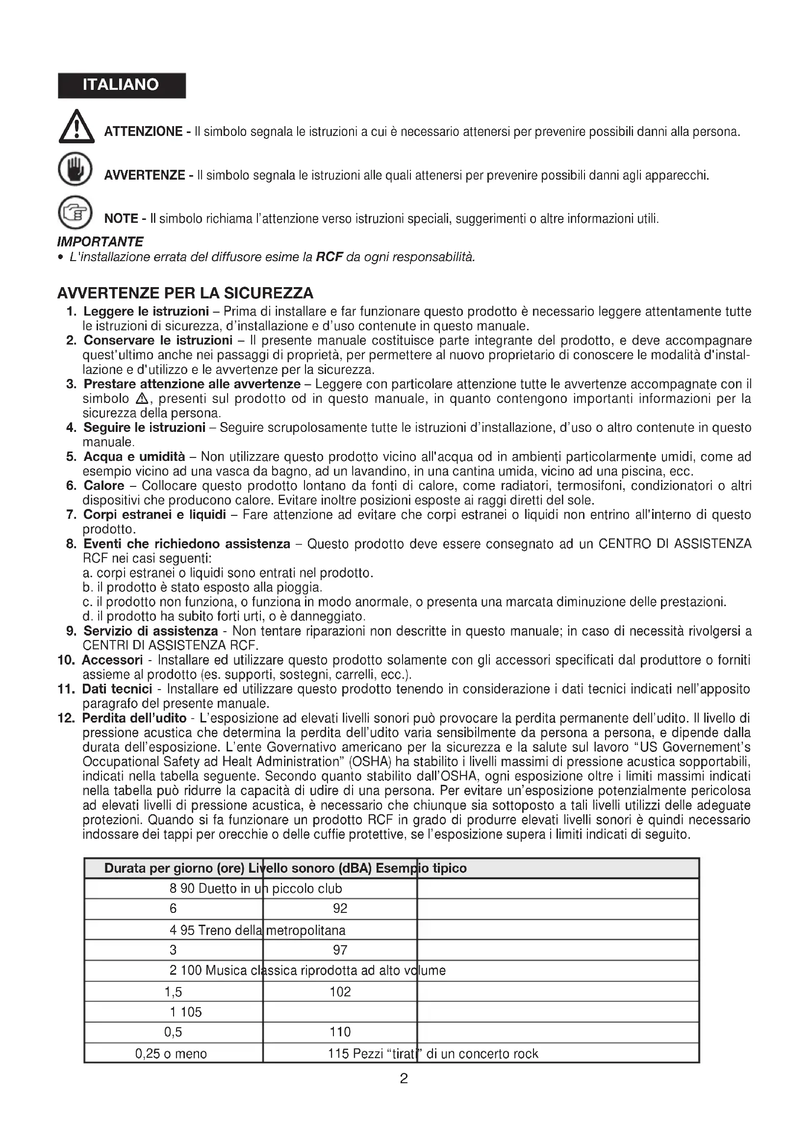 - Perdita dell'udito - L'esposizione ad elevati livelli sonori cui provocare la perdita permanente dell'udito. Il livello di pressione acustica che determina la perdita dell'udito varia sensibilmente da persona a persona, e dipende alla durata dell'esposizione. L'ente Governativo americano per la sicurezza e la salute sul lavoro "US Government's Occupational Safety ad Healt Administration" (OSHA) ha stabilito i livelli massimi di pressione acustica所提供tabili, indicati nella tabella seguite. Secondo quanto stabilito dall'OSHA, agli esposizione altre i limiti massimi indicati nella tabella cui ridurre la capacité di udire di una persona. Per evitare un'esposizione potenzialmente pericolosa ad elevati livelli di pressione acustica, è necessario che chiunque via sottomosto a tali livelli utilizzi delle adeguate protezioni. Quando si fa funzionare un prodotto RCF in grado di produire elevati livelli sonori è quindi necessario indossare dei tappi per orecchio o delle cuffie protettive, se l'esposizione supera i limiti indicati di seguito.