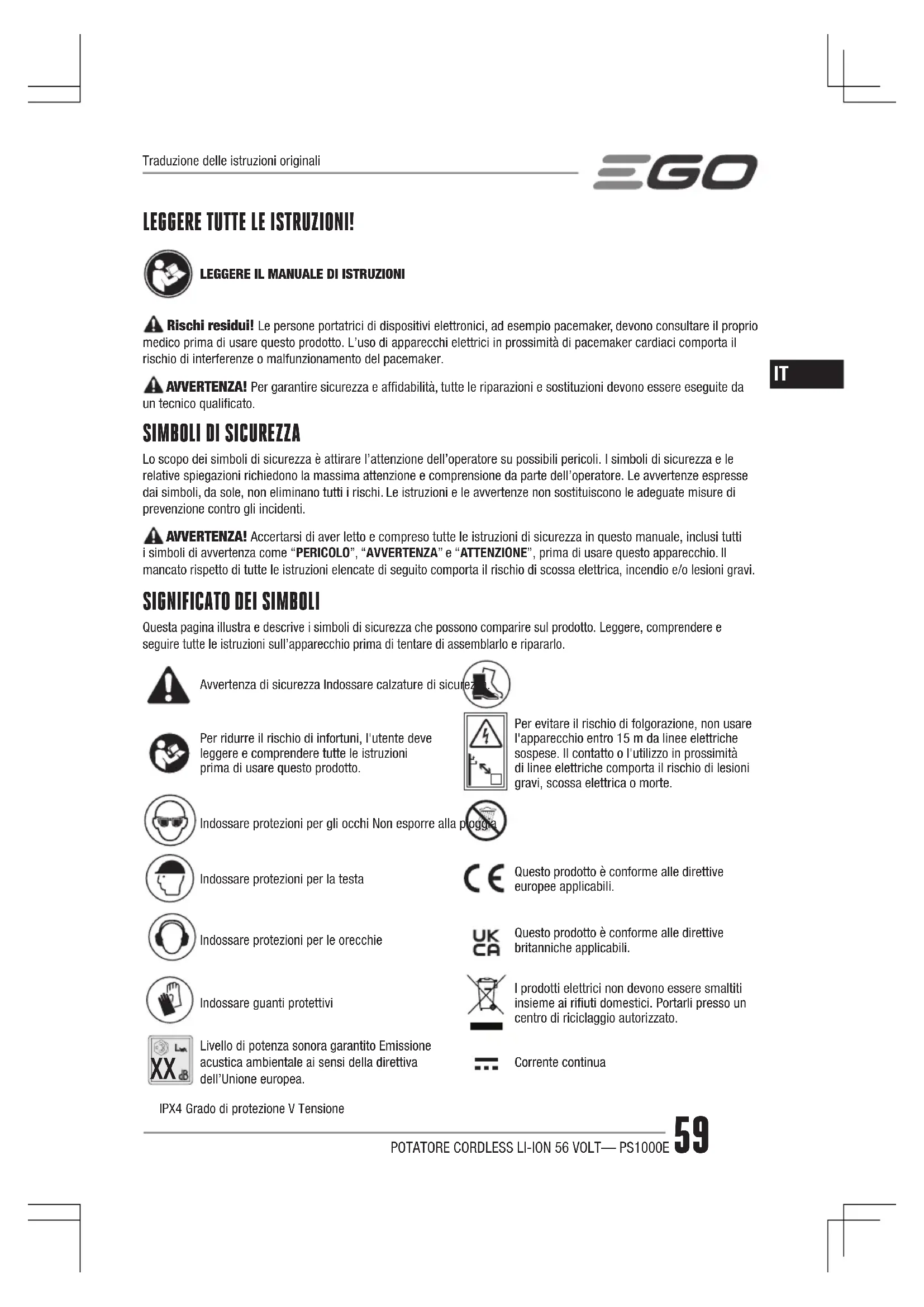 L’UNITÀ MOTORE E L’ACCESSORIO POTATORE (modello EP1000) AVVERTENZA! Non installare o regolare l’accessorio quando l’unità motore è in funzione o con la batteria installata per evitare il rischio di lesioni gravi. L’asta di prolunga è destinata al solo uso con il prodotto EGO PS1000E. Non utilizzarla con altri accessori EGO.POTATORE CORDLESS LI-ION 56 VOLT— PS1000E62
