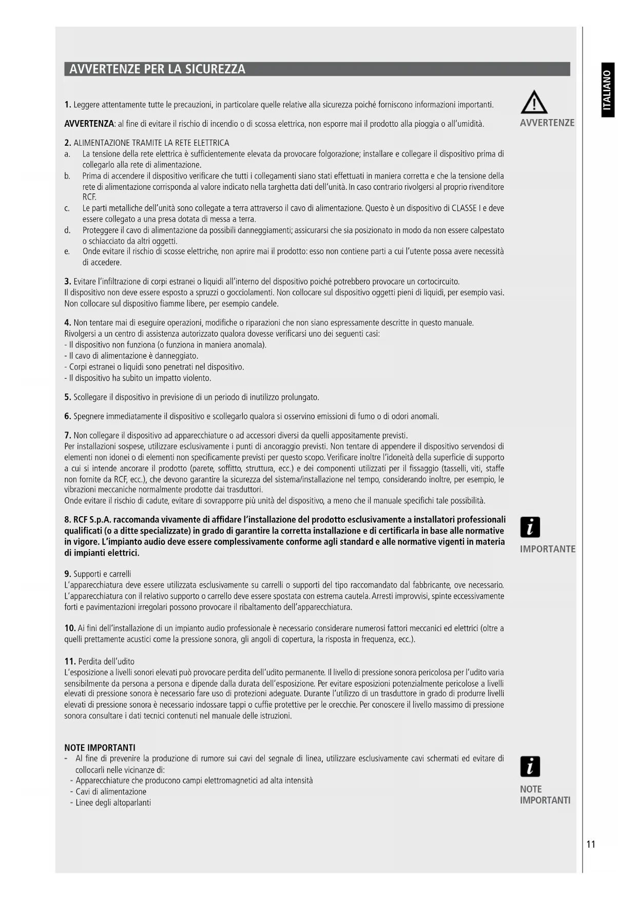 RCF S.p.A. raccomanda vivamente di affidare l'installazione del prodotto esclusivamente a installatori professionali qualificati (o a ditte specializzate) in grado di garantire la corretta installazione e di certificarla in base alle normative in vigore. L'impianto audio deve essere complessivamente conforme agli standard e alle normative vigenti in materia di impianti elettrici.