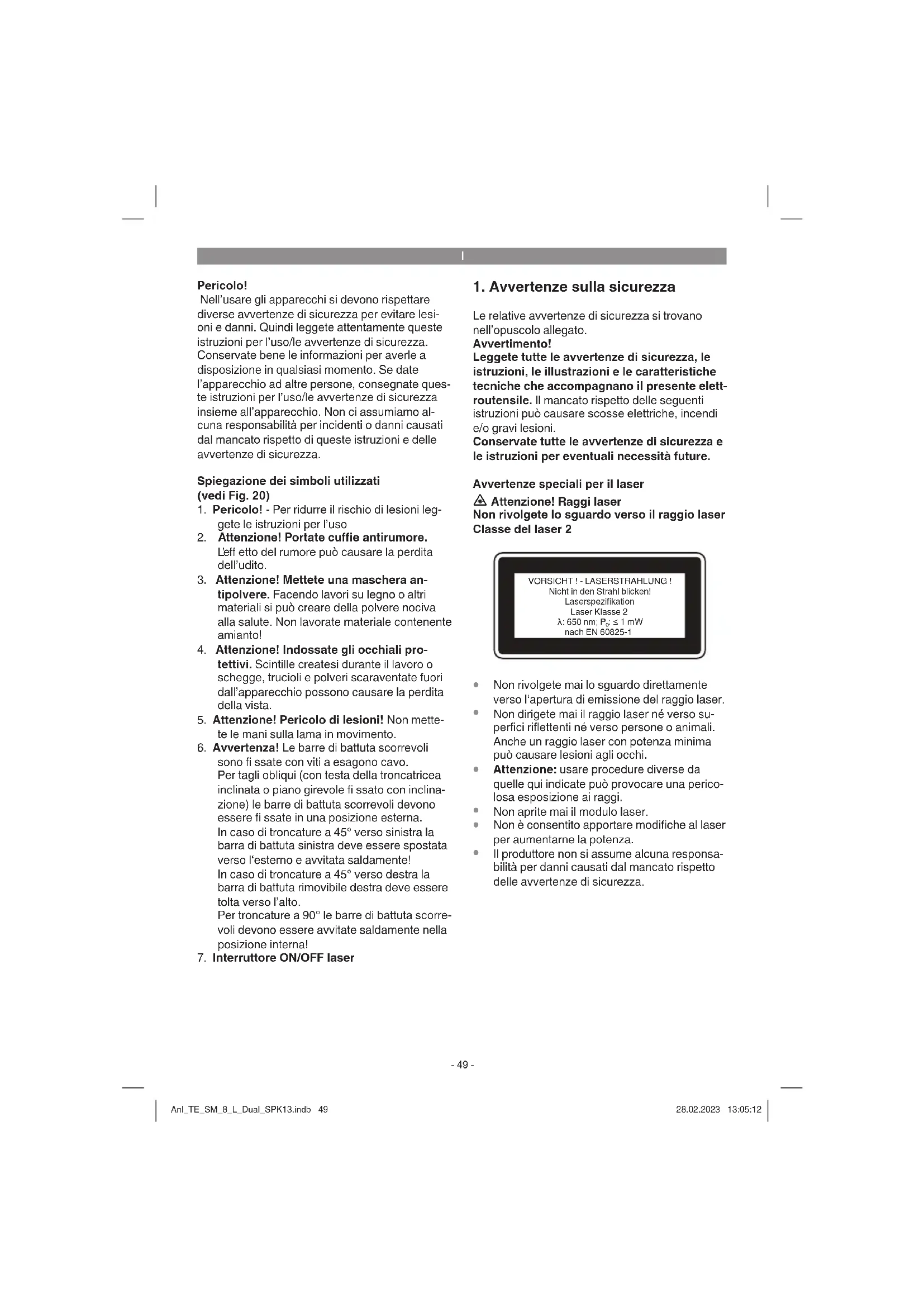 Le relative avvertenze di sicurezza si trovano nell’opuscolo allegato. Avvertimento! Leggete tutte le avvertenze di sicurezza, le istruzioni, le illustrazioni e le caratteristiche tecniche che accompagnano il presente elett- routensile. Il mancato rispetto delle seguenti istruzioni può causare scosse elettriche, incendi e/o gravi lesioni. Conservate tutte le avvertenze di sicurezza e le istruzioni per eventuali necessità future. Avvertenze speciali per il laser Attenzione! Raggi laser Non rivolgete lo sguardo verso il raggio laser Classe del laser 2 VORSICHT ! - LASERSTRAHLUNG ! Nicht in den Strahl blicken! Laserspezifikation Laser Klasse 2 Ǹ: 650 nm; P