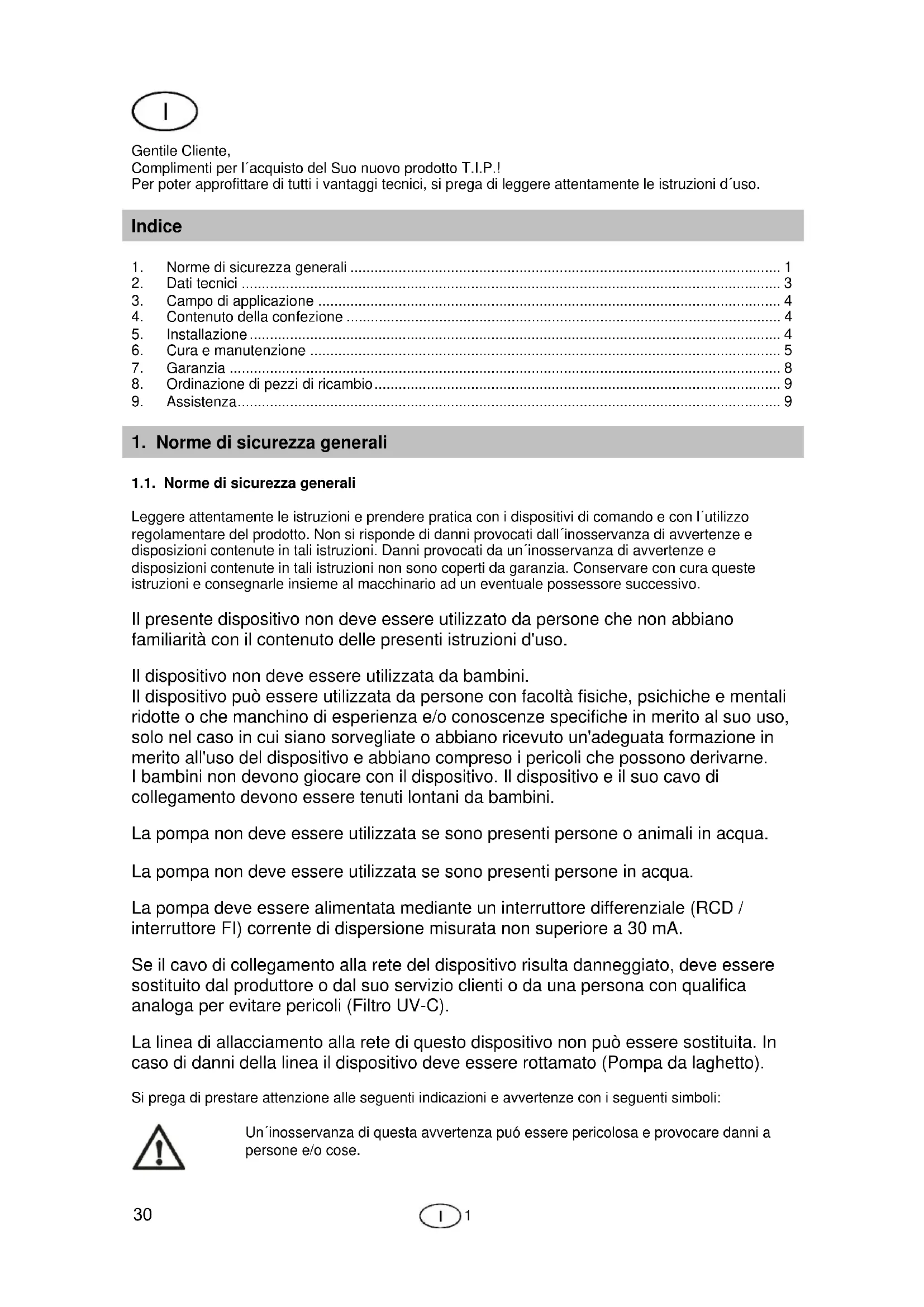 1.1. Norme di sicurezza generali Leggere attentamente le istruzioni e prendere pratica con i dispositivi di comando e con l´utilizzo regolamentare del prodotto. Non si risponde di danni provocati dall´inosservanza di avvertenze e disposizioni contenute in tali istruzioni. Danni provocati da un´inosservanza di avvertenze e disposizioni contenute in tali istruzioni non sono coperti da garanzia. Conservare con cura queste istruzioni e consegnarle insieme al macchinario ad un eventuale possessore successivo. Il presente dispositivo non deve essere utilizzato da persone che non abbiano familiarità con il contenuto delle presenti istruzioni d'uso. Il dispositivo non deve essere utilizzata da bambini. Il dispositivo può essere utilizzata da persone con facoltà fisiche, psichiche e mentali ridotte o che manchino di esperienza e/o conoscenze specifiche in merito al suo uso, solo nel caso in cui siano sorvegliate o abbiano ricevuto un'adeguata formazione in merito all'uso del dispositivo e abbiano compreso i pericoli che possono derivarne. I bambini non devono giocare con il dispositivo. Il dispositivo e il suo cavo di collegamento devono essere tenuti lontani da bambini. La pompa non deve essere utilizzata se sono presenti persone o animali in acqua. La pompa non deve essere utilizzata se sono presenti persone in acqua. La pompa deve essere alimentata mediante un interruttore differenziale (RCD / interruttore FI) corrente di dispersione misurata non superiore a 30 mA. Se il cavo di collegamento alla rete del dispositivo risulta danneggiato, deve essere sostituito dal produttore o dal suo servizio clienti o da una persona con qualifica analoga per evitare pericoli (Filtro UV-C). La linea di allacciamento alla rete di questo dispositivo non può essere sostituita. In caso di danni della linea il dispositivo deve essere rottamato (Pompa da laghetto). Si prega di prestare attenzione alle seguenti indicazioni e avvertenze con i seguenti simboli:
