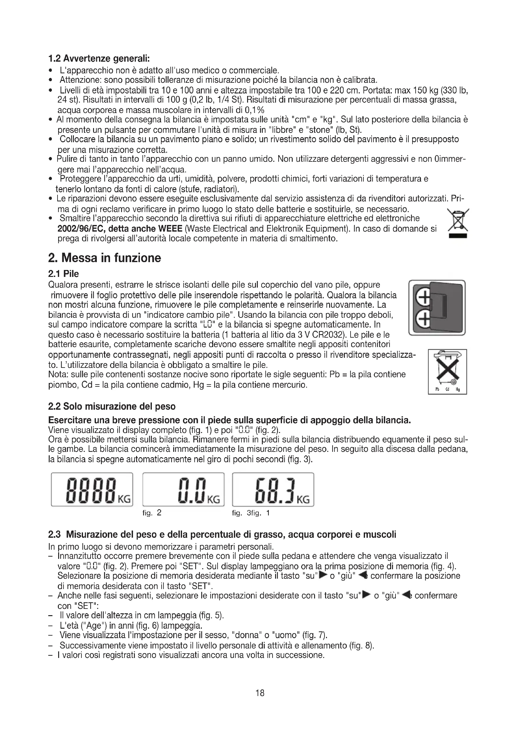 Molto elevata: intensa attività fisica, allenamento intenso o duro, attività quotidiana per almeno 1 ora. Dopochetuttiiparametrisonostatiinseriti,labilanciapuòmisurareancheilgrassocorporeoeglialtrivalori. Misurazione: – Esercitare una pressione con il piede sulla superficie di appoggio della bilancia. – Premere più volte il tasto o per selezionare la posizione di memoria in cui sono registrati i propri dati personali. Questi vengono visualizzati in sequenza fino a quando non comparirà il valore "0.0"(fig.2). – Saliresullabilanciaapiedinudi,facendoattenzioneaposareipiedisuentrambiglielettrodi.Verràinnanzitut- to rilevato e visualizzato il peso corporeo.