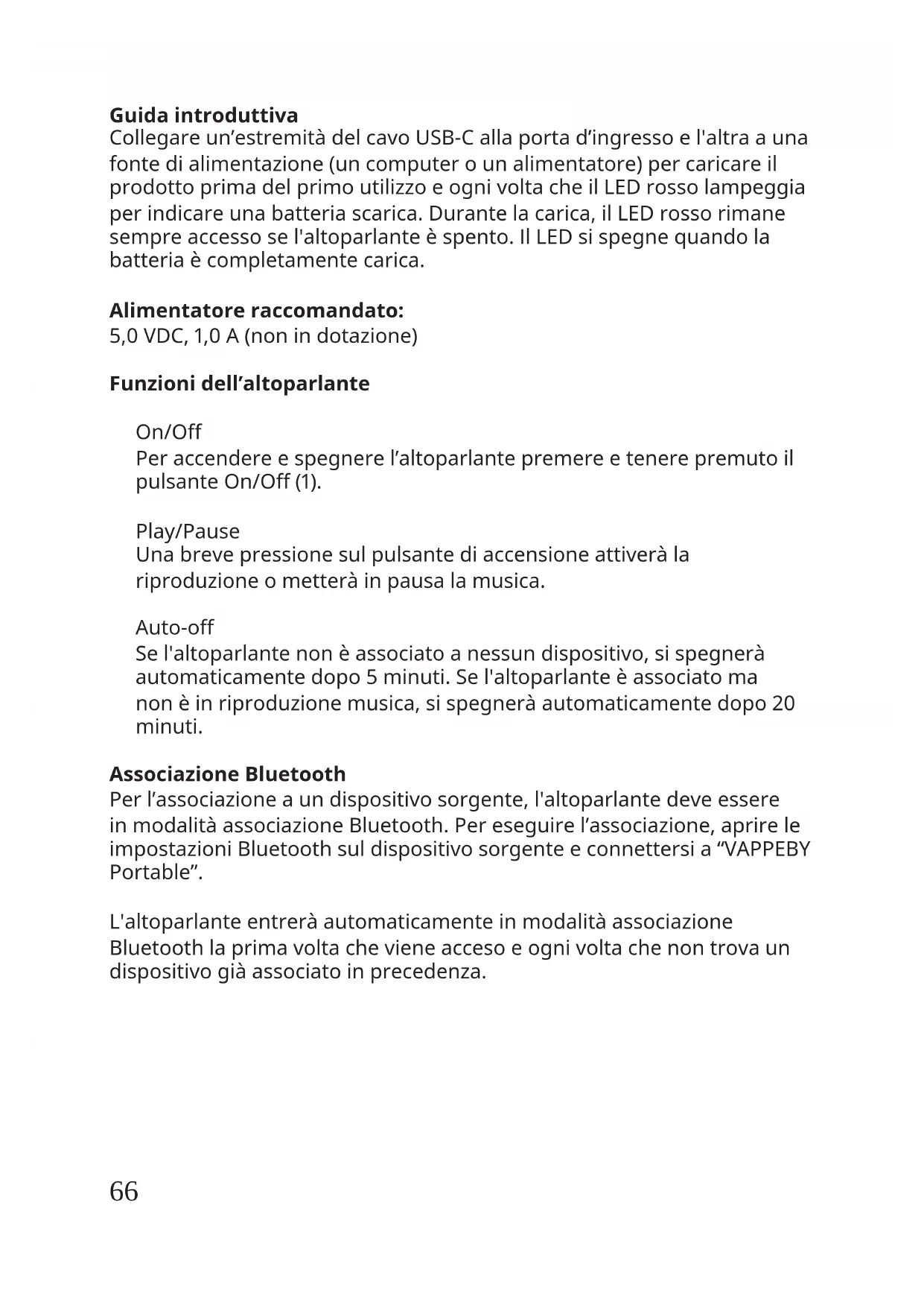 LED stato Bianco lampeggiante:AssociazioneBluetooth. Biancosso:Associatoaundispositivo. Rosso lampeggiante:Batteriascarica. Rossosso:Incarica(quandol'altoparlanteèspento). Italiano66 Guida introduttiva Collegareun’estremitàdelcavoUSB-Callaportad’ingressoel'altraauna fontedialimentazione(uncomputerounalimentatore)percaricareil prodottoprimadelprimoutilizzoeognivoltacheilLEDrossolampeggia perindicareunabatteriascarica.Durantelacarica,ilLEDrossorimane sempreaccessosel'altoparlanteèspento.IlLEDsispegnequandola batteriaècompletamentecarica. Alimentatore raccomandato: 5,0VDC,1,0A(nonindotazione) Funzioni dell’altoparlante On/O Peraccendereespegnerel’altoparlantepremereetenerepremutoil pulsanteOn/O(1). Play/Pause Unabrevepressionesulpulsantediaccensioneattiveràla riproduzioneometteràinpausalamusica. Auto-o Sel'altoparlantenonèassociatoanessundispositivo,sispegnerà automaticamentedopo5minuti.Sel'altoparlanteèassociatoma nonèinriproduzionemusica,sispegneràautomaticamentedopo20 minuti. Associazione Bluetooth Perl’associazioneaundispositivosorgente,l'altoparlantedeveessere inmodalitàassociazioneBluetooth.Pereseguirel’associazione,aprirele impostazioniBluetoothsuldispositivosorgenteeconnettersia“VAPPEBY Portable”. L'altoparlanteentreràautomaticamenteinmodalitàassociazione Bluetoothlaprimavoltachevieneaccesoeognivoltachenontrovaun dispositivogiàassociatoinprecedenza.67 Ripristinodelleimpostazionidifabbrica PerrimuovereprecedentiassociazioniBluetooth,ripristinare i´l’altoparlantetenendopremutoilpulsante(1)perpiùdi5secondi.Il correttoripristinodelleimpostazionidifabbricaèconfermatodalLED rossolampeggianteedaunsegnaleacustico. Inalternativa,accederealmenuBluetoothsuldispositivosorgentee annullarel'associazione. Associazione stereo: ÈpossibileassociareduedispositiviportatiliVAPPEBYinmodalitàstereo: 1.Assicuraticheentrambiglialtoparlantisianoinmodalitàricerca Bluetooth. 2.Premereduevolteilpulsantediaccensionesuunodeglialtoparlanti. Unsegnaleacusticoconfermeràlacorrettaassociazionestereo. 3.Connettersialdispositivosorgenteseguendoleistruzionidi associazioneBluetooth. Informazioni utili