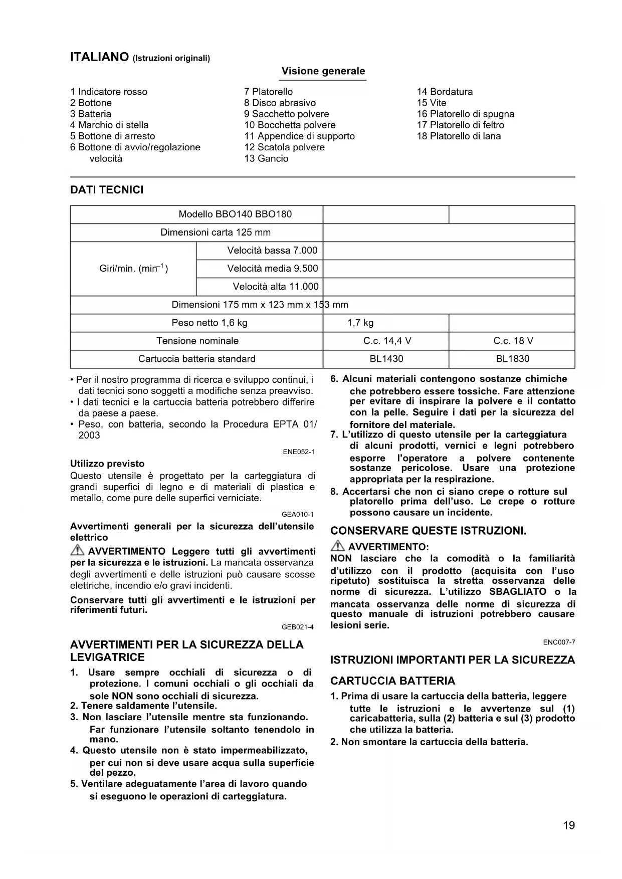 ENE052-1 Utilizzo previsto Questo utensile è progettato per la carteggiatura di grandi superfici di legno e di materiali di plastica e metallo, come pure delle superfici verniciate. GEA010-1 Avvertimenti generali per la sicurezza dell’utensile elettrico AVVERTIMENTO Leggere tutti gli avvertimenti per la sicurezza e le istruzioni. La mancata osservanza degli avvertimenti e delle istruzioni può causare scosse elettriche, incendio e/o gravi incidenti. Conservare tutti gli avvertimenti e le istruzioni per riferimenti futuri. GEB021-4