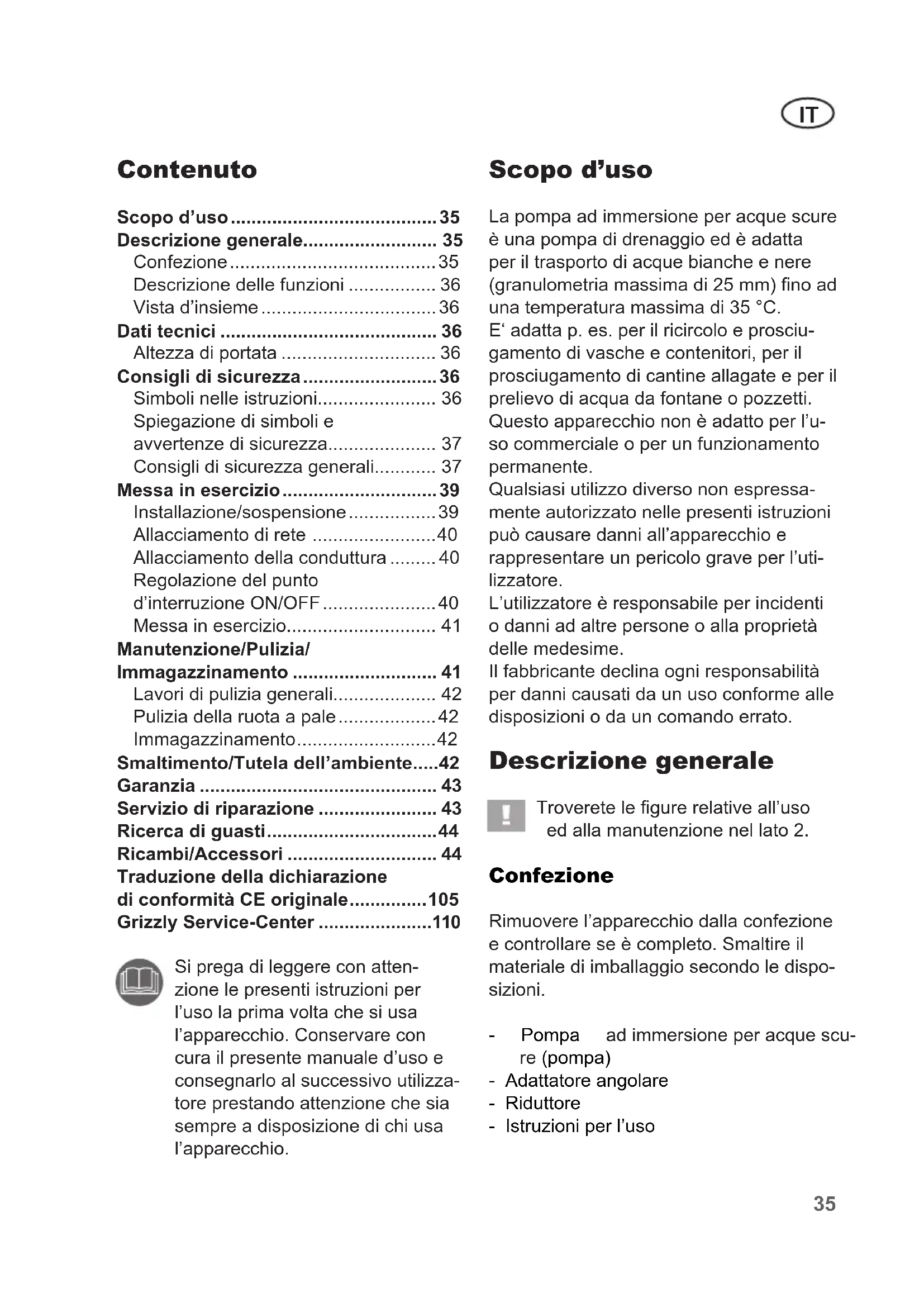- Escludi alla garanzia sono danni dovuti a trasporti di liquidi aggressivi o altri usi impropri, poiché in tali casi vengono danneggiati guarnizioni, ruota a pale, motore o altri componenti della pompa. Anche le pomp per acque fangose non sono adatte per il trasporto di materiali abrasivi (sabbia, pietre).