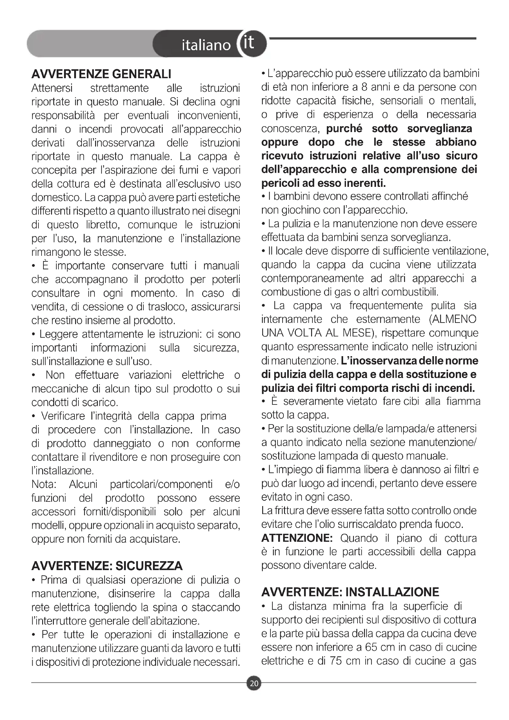 Attenersi strettamente alle istruzioni riportate in questo manuale. Si declina ogni responsabilità per eventuali inconvenienti, danni o incendi provocati all'apparecchio derivati dall'inosservanza delle istruzioni riportate in questo manuale. La cappa è concepita per l'aspirazione dei fumi e vapori della cottura ed è destinata all'esclusivo uso domestico. La cappa può avere parti estetiche differenti rispetto a quanto illustrato nei disegni di questo libretto, comunque le istruzioni per l'uso, la manutenzione e l'installazione rimangono le stesse.