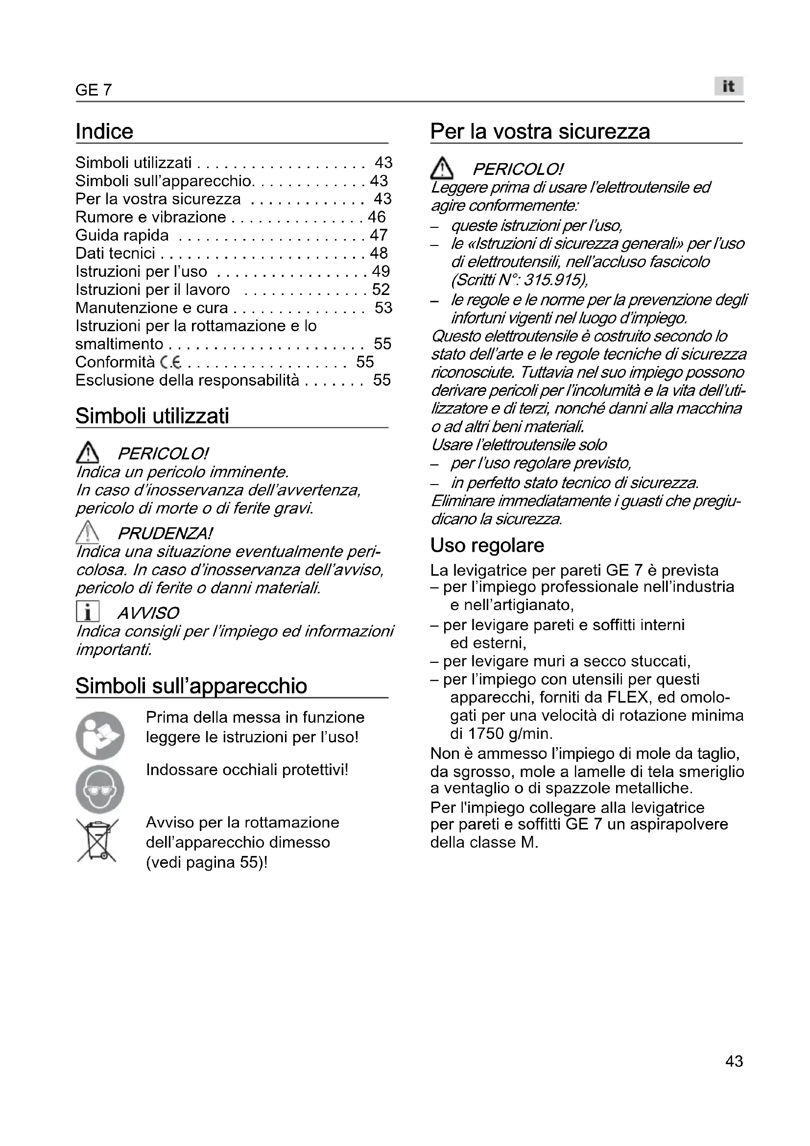 in perfetto stato tecnico di sicurezza. Eliminare immediatamente i guasti che pregiu- dicano la sicurezza. Uso regolare La levigatrice per pareti GE 7 è prevista – per l’impiego professionale nell’industria e nell’artigianato, – per levigare pareti e soffitti interni ed esterni, – per levigare muri a secco stuccati, – per l’impiego con utensili per questi apparecchi, forniti da FLEX, ed omolo- gati per una velocità di rotazione minima di 1750 g/min. Non è ammesso l’impiego di mole da taglio, da sgrosso, mole a lamelle di tela smeriglio a ventaglio o di spazzole metalliche. Per l'impiego collegare alla levigatrice per pareti e soffitti GE 7 un aspirapolvere della classe M.GE 7