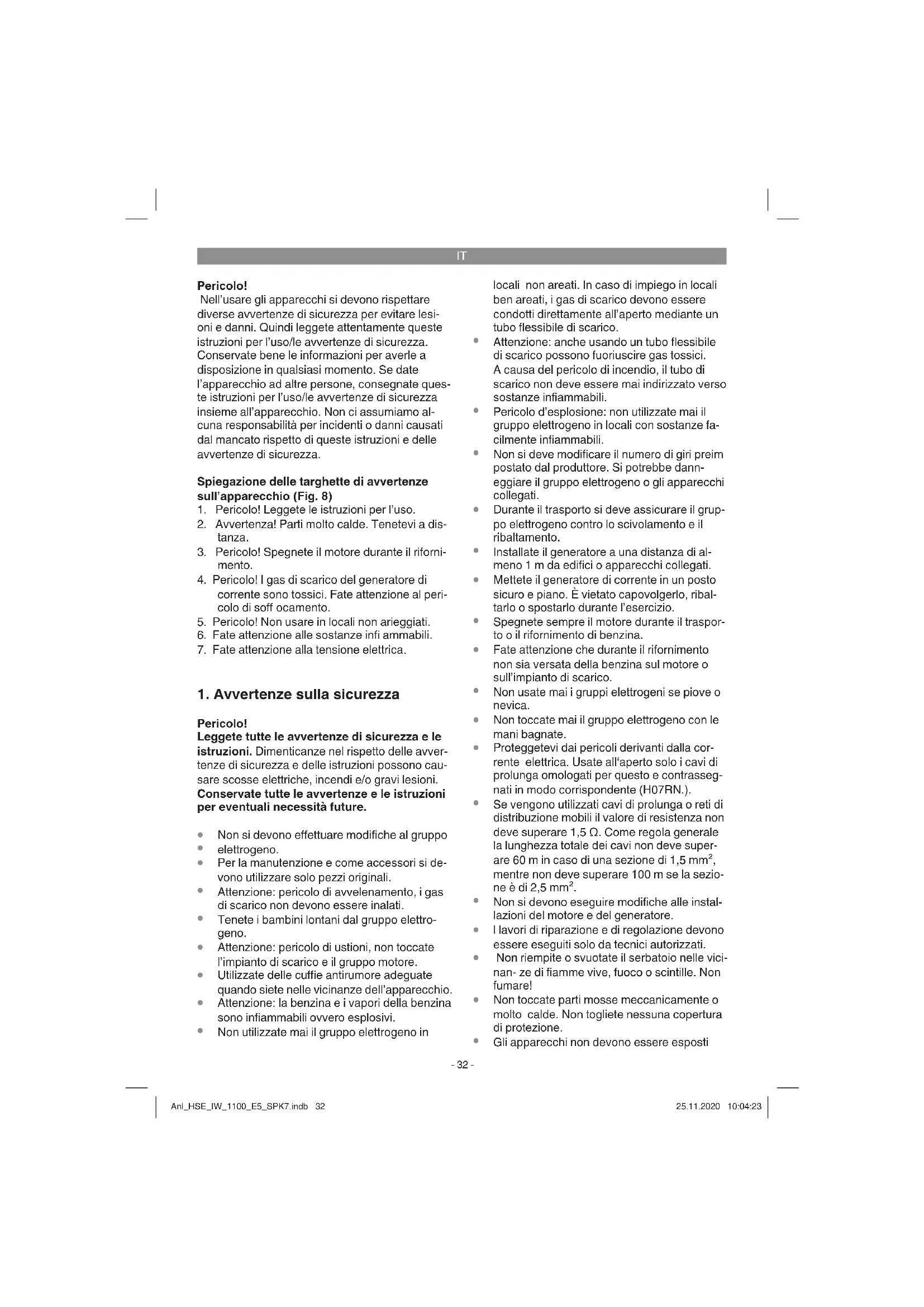 Non collegate il generatore alla rete elettrica di casa, perché ne possono derivare dei dan- ni al generatore o ad altre apparecchiature elettriche in casa. Avvertenza: alcuni apparecchi elettrici (seghetti alternativi a motore, trapani, ecc.) possono avere un assorbimento di corrente maggiore se utilizzati in condizioni diffi cili. In caso di dubbio chiedete al costruttore del vost- ro apparecchio. Anl_HSE_IW_1100_E5_SPK7.indb 35Anl_HSE_IW_1100_E5_SPK7.indb 35 25.11.2020 10:04:2525.11.2020 10:04:25IT