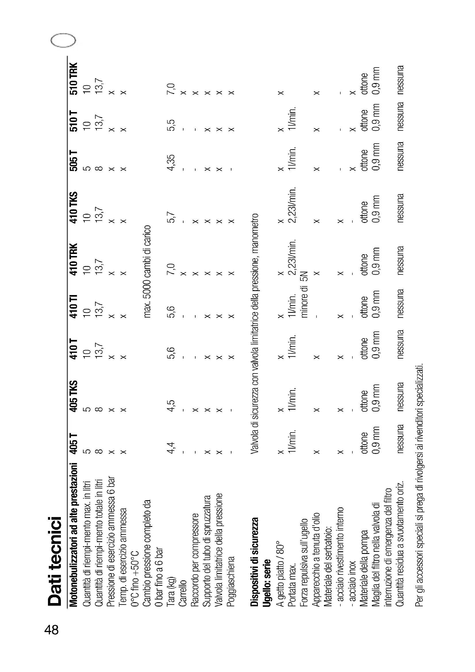 Dati tecnici Motonebulizzatori ad alte prestazioni 405 T 405 TKS 410 T 410 TI 410 TRK 410 TKS 505 T 510 T 510 TRK Quantità di riempi-mento max. in litri 5 5 10 10 10 10 5 10 10 Quantità di riempi-mento totale in litri 8 8 13,7 13,7 13,7 13,7 8 13,7 13,7 Pressione di esercizio ammessa 6 bar x x x x x x x x x Temp. di esercizio ammessa x x x x x x x x x 0°C fino +50°C Cambio pressione completo da max. 5000 cambi di carico 0 bar fino a 6 bar Tara (kg) 4,4 4,5 5,6 5,6 7,0 5,7 4,35 5,5 7,0 Carrello - - - - x - - - x Raccordo per compressore - x - - x x - - x Supporto del tubo di spruzzatura x x x x x x x x x Valvola limitatrice della pressione x x x x x x x x x Poggiaschiena - - x x x x - x x Dispositivi di sicurezza Valvola di sicurezza con valvola limitatrice della pressione, manometro Ugello: serie A getto piatto / 80° x x x x x x x x x Portata max. 1l/min. 1l/min. 1l/min. 1l/min. 2,23l/min. 2,23l/min. 1l/min. 1l/min. Forza repulsiva sull’ugello minore di 5N Apparecchio a tenuta d'olio x x x - x x x x x Materiale del serbatoio: - acciaio rivestimento interno x x x x x x - - - - acciaio inox - - - - - - x x x Materiale della pompa ottone ottone ottone ottone ottone ottone ottone ottone ottone Maglia del filtro nella valvola di 0,9 mm 0,9 mm 0,9 mm 0,9 mm 0,9 mm 0,9 mm 0,9 mm 0,9 mm 0,9 mm interruzione di emergenza del filtro Quantità residua a svuotamento oriz. nessuna nessuna nessuna nessuna nessuna nessuna nessuna nessuna nessuna Per gli accessori speciali si prega di rivolgersi ai rivenditori specializzati.49 Indice Dati tecnici ...48 Importanti indicazioni sulla sicurezza