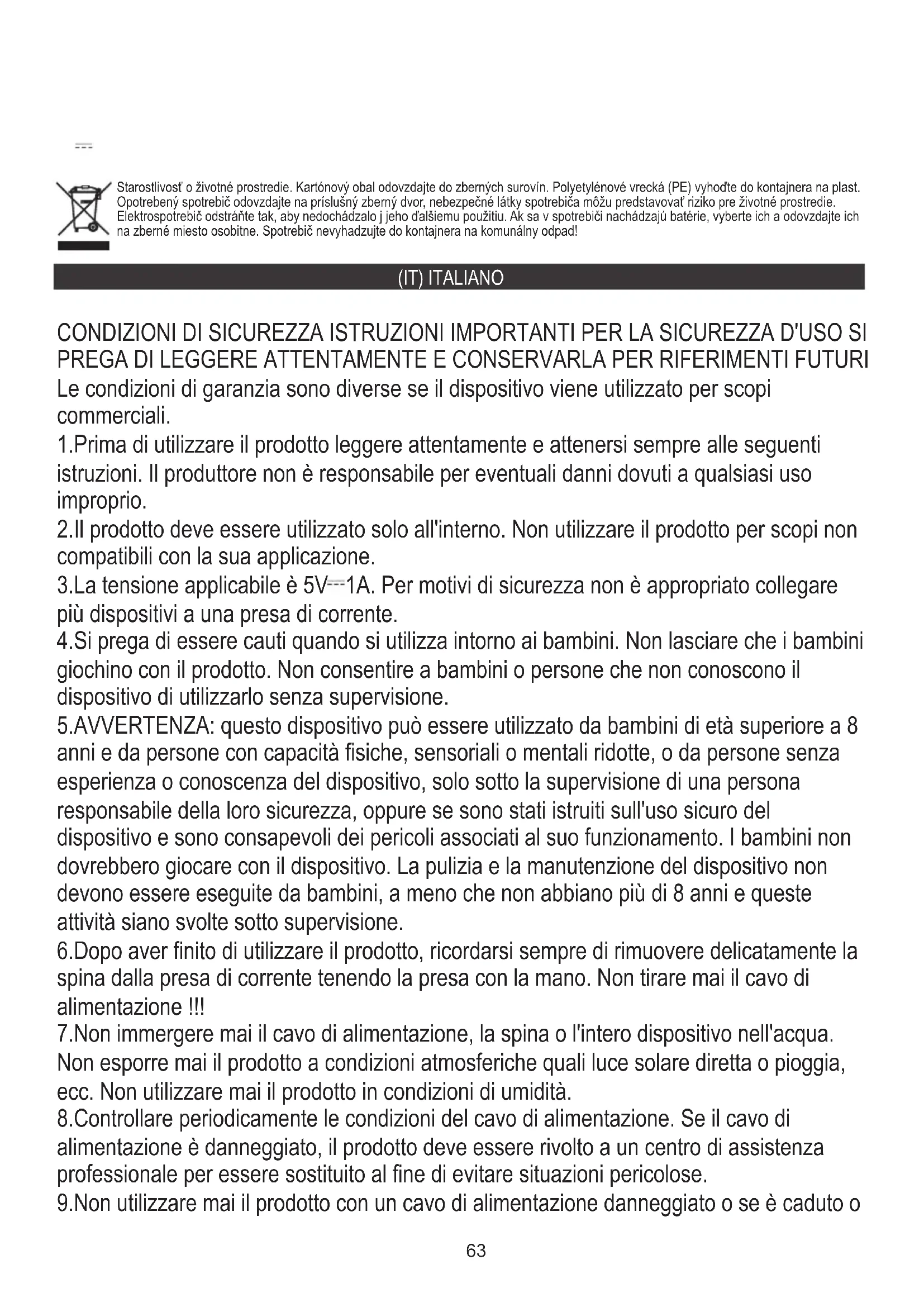 Nominálny výkon: 5W Napájanie: 5V 1A63 Starostlivosť o životné prostredie. Kartónový obal odovzdajte do zberných surovín. Polyetylénové vrecká (PE) vyhoďte do kontajnera na plast. Opotrebený spotrebič odovzdajte na príslušný zberný dvor, nebezpečné látky spotrebiča môžu predstavovať riziko pre životné prostredie. Elektrospotrebič odstráňte tak, aby nedochádzalo j jeho ďalšiemu použitiu. Ak sa v spotrebiči nachádzajú batérie, vyberte ich a odovzdajte ich na zberné miesto osobitne. Spotrebič nevyhadzujte do kontajnera na komunálny odpad! CONDIZIONI DI SICUREZZA ISTRUZIONI IMPORTANTI PER LA SICUREZZA D'USO SI PREGA DI LEGGERE ATTENTAMENTE E CONSERVARLA PER RIFERIMENTI FUTURI Le condizioni di garanzia sono diverse se il dispositivo viene utilizzato per scopi commerciali. 1.Prima di utilizzare il prodotto leggere attentamente e attenersi sempre alle seguenti istruzioni. Il produttore non è responsabile per eventuali danni dovuti a qualsiasi uso improprio. 2.Il prodotto deve essere utilizzato solo all'interno. Non utilizzare il prodotto per scopi non compatibili con la sua applicazione. 3.La tensione applicabile è 5V 1A. Per motivi di sicurezza non è appropriato collegare più dispositivi a una presa di corrente. 4.Si prega di essere cauti quando si utilizza intorno ai bambini. Non lasciare che i bambini giochino con il prodotto. Non consentire a bambini o persone che non conoscono il dispositivo di utilizzarlo senza supervisione. 5.AVVERTENZA: questo dispositivo può essere utilizzato da bambini di età superiore a 8 anni e da persone con capacità fisiche, sensoriali o mentali ridotte, o da persone senza esperienza o conoscenza del dispositivo, solo sotto la supervisione di una persona responsabile della loro sicurezza, oppure se sono stati istruiti sull'uso sicuro del dispositivo e sono consapevoli dei pericoli associati al suo funzionamento. I bambini non dovrebbero giocare con il dispositivo. La pulizia e la manutenzione del dispositivo non devono essere eseguite da bambini, a meno che non abbiano più di 8 anni e queste attività siano svolte sotto supervisione. 6.Dopo aver finito di utilizzare il prodotto, ricordarsi sempre di rimuovere delicatamente la spina dalla presa di corrente tenendo la presa con la mano. Non tirare mai il cavo di alimentazione !!! 7.Non immergere mai il cavo di alimentazione, la spina o l'intero dispositivo nell'acqua. Non esporre mai il prodotto a condizioni atmosferiche quali luce solare diretta o pioggia, ecc. Non utilizzare mai il prodotto in condizioni di umidità. 8.Controllare periodicamente le condizioni del cavo di alimentazione. Se il cavo di alimentazione è danneggiato, il prodotto deve essere rivolto a un centro di assistenza professionale per essere sostituito al fine di evitare situazioni pericolose. 9.Non utilizzare mai il prodotto con un cavo di alimentazione danneggiato o se è caduto o (IT) ITALIANO64 è stato danneggiato in qualsiasi altro modo o se non funziona correttamente. Non tentare di riparare da soli il prodotto difettoso perché può provocare scosse elettriche. Rivolgere sempre il dispositivo danneggiato a un centro di assistenza professionale per ripararlo. Tutte le riparazioni possono essere eseguite solo da professionisti dell'assistenza autorizzati. La riparazione eseguita in modo errato può causare situazioni pericolose per l'utente. 10.Non posizionare mai il prodotto sopra o vicino a superfici calde o calde o elettrodomestici da cucina come il forno elettrico o il fornello a gas. 11.Non utilizzare mai il prodotto vicino a combustibili. 12.Non lasciare che il cavo penda dal bordo del bancone o che tocchi superfici calde.