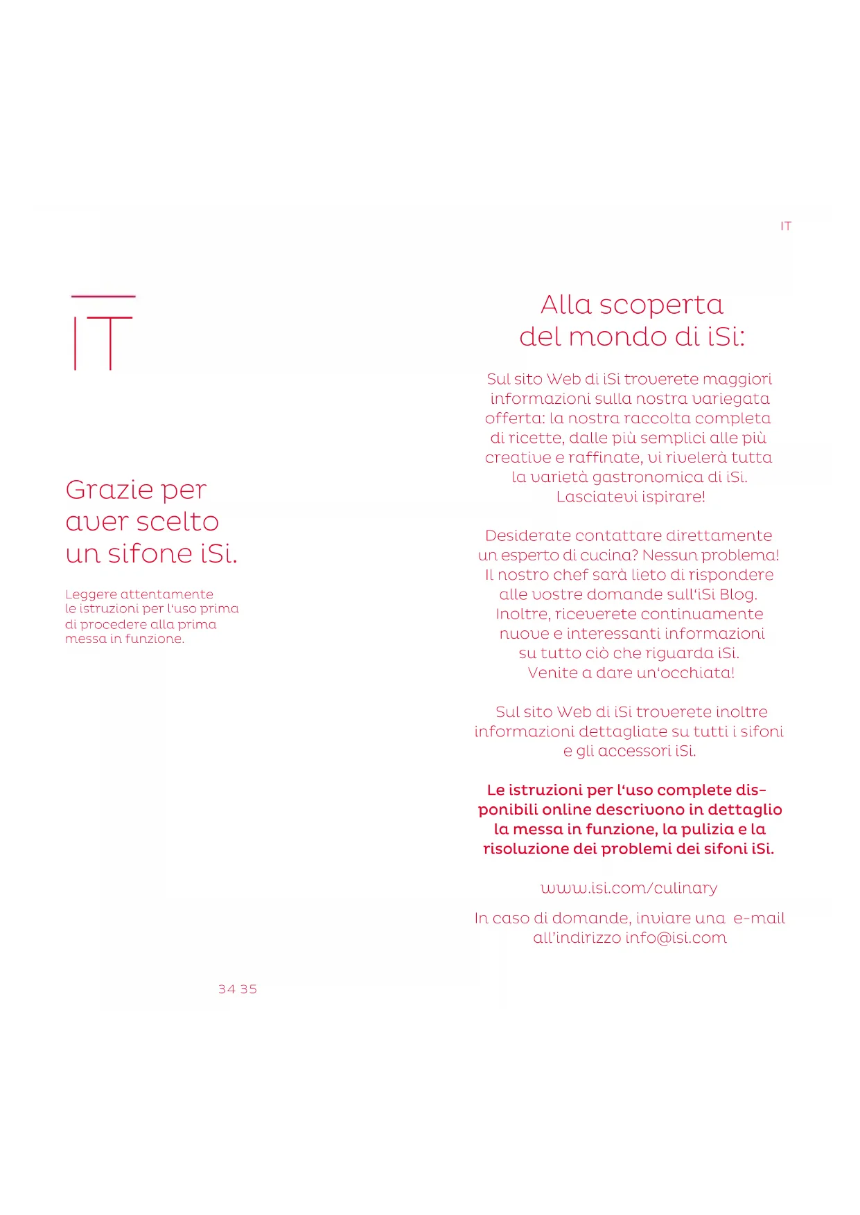 endommagé ——— «Évacuer la pression» et envoyer le siphon à iSi ou au service après-vente. Maintenance. Les pièces de rechange sont disponibles à l'unité et peu onéreuses. Pour les commandes de pièces de rechange, prenez contact avec votre revendeur. Possible également en Autriche sur info@isi.com. En cas de réparation, envoyer le siphon complet. FR34 35 Alla scoperta del mondo di iSi: Sul sito Web di iSi troverete maggiori informazioni sulla nostra variegata offerta: la nostra raccolta completa di ricette, dalle più semplici alle più creative e raffinate, vi rivelerà tutta la varietà gastronomica di iSi. Lasciatevi ispirare! Desiderate contattare direttamente un esperto di cucina? Nessun problema! Il nostro chef sarà lieto di rispondere alle vostre domande sull‘iSi Blog. Inoltre, riceverete continuamente nuove e interessanti informazioni su tutto ciò che riguarda iSi. Venite a dare un‘occhiata! Sul sito Web di iSi troverete inoltre informazioni dettagliate su tutti i sifoni e gli accessori iSi. Le istruzioni per l‘uso complete dis- ponibili online descrivono in dettaglio la messa in funzione, la pulizia e la risoluzione dei problemi dei sifoni iSi. www.isi.com/culinary In caso di domande, inviare una e-mail all’indirizzo info@isi.com