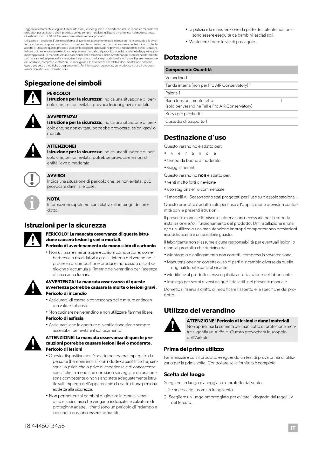 - Impiego per scopi diversi da quelli descritti nel presente manuale Dometic si riserva il diritto di modificare l’aspetto e le specifiche del pro- dotto. Utilizzo del verandino