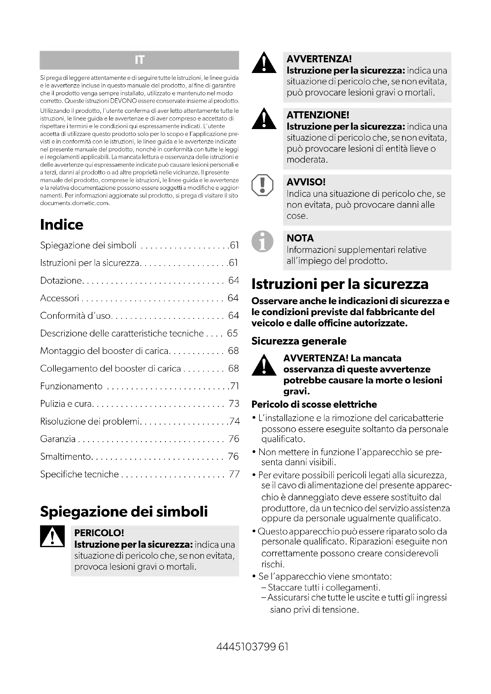 - Si prega di leggere attentamente e di seguire tutte le istruzioni, le linee guida e le avvertenze incluse in questo manuale del prodotto, al fine di garantire che il prodotto venga sempre installato, utilizzato e mantenuto nel modo corretto. Queste istruzioni DEVONO essere conservate insieme al prodotto.Utilizzando il prodotto, l’utente conferma di aver letto attentamente tutte le istruzioni, le linee guida e le avvertenze e di aver compreso e accettato di rispettare i termini e le condizioni qui espressamente indicati. L’utente accetta di utilizzare questo prodotto solo per lo scopo e l’applicazione pre-visti e in conformità con le istruzioni, le linee guida e le avvertenze indicate nel presente manuale del prodotto, nonché in conformità con tutte le leggi e i regolamenti applicabili. La mancata lettura e osservanza delle istruzioni e delle avvertenze qui espressamente indicate può causare lesioni personali e a terzi, danni al prodotto o ad altre proprietà nelle vicinanze. Il presente manuale del prodotto, comprese le istruzioni, le linee guida e le avvertenze e la relativa documentazione possono essere soggetti a modifiche e aggior-namenti. Per informazioni aggiornate sul prodotto, si prega di visitare il sito documents.dometic.com. Indice Spiegazione dei simboli p. 61