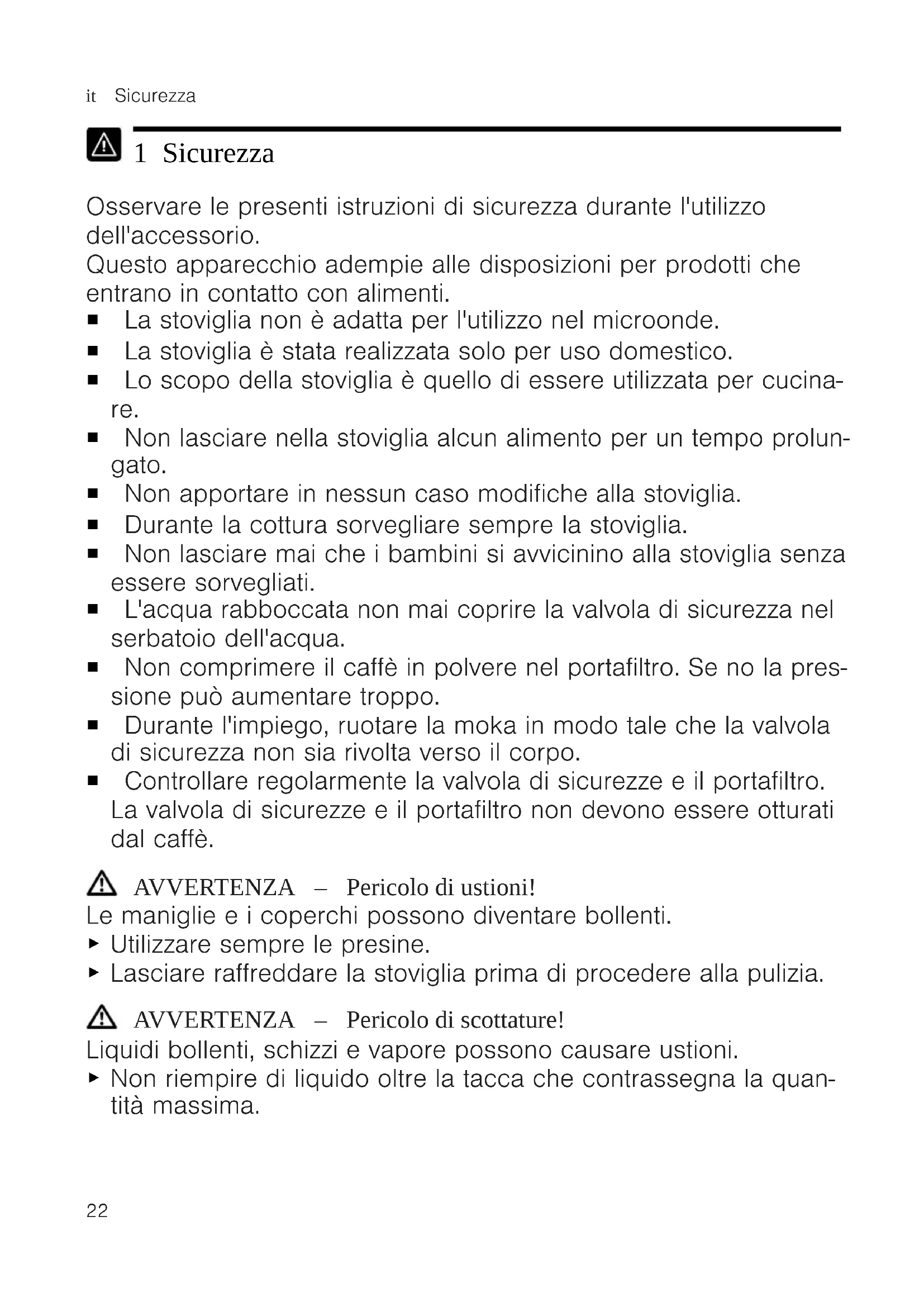 1 Sicurezza Osservare le presenti istruzioni di sicurezza durante l'utilizzo dell'accessorio. Questo apparecchio adempie alle disposizioni per prodotti che entrano in contatto con alimenti. ¡ La stoviglia non è adatta per l'utilizzo nel microonde. ¡ La stoviglia è stata realizzata solo per uso domestico. ¡ Lo scopo della stoviglia è quello di essere utilizzata per cucina- re. ¡ Non lasciare nella stoviglia alcun alimento per un tempo prolun- gato. ¡ Non apportare in nessun caso modifiche alla stoviglia. ¡ Durante la cottura sorvegliare sempre la stoviglia. ¡ Non lasciare mai che i bambini si avvicinino alla stoviglia senza essere sorvegliati. ¡ L'acqua rabboccata non mai coprire la valvola di sicurezza nel serbatoio dell'acqua. ¡ Non comprimere il caffè in polvere nel portafiltro. Se no la pres- sione può aumentare troppo. ¡ Durante l'impiego, ruotare la moka in modo tale che la valvola di sicurezza non sia rivolta verso il corpo. ¡ Controllare regolarmente la valvola di sicurezze e il portafiltro. La valvola di sicurezze e il portafiltro non devono essere otturati dal caffè. AVVERTENZA‒Pericolo di ustioni! Le maniglie e i coperchi possono diventare bollenti. ▶ Utilizzare sempre le presine. ▶ Lasciare raffreddare la stoviglia prima di procedere alla pulizia. AVVERTENZA‒Pericolo di scottature! Liquidi bollenti, schizzi e vapore possono causare ustioni. ▶ Non riempire di liquido oltre la tacca che contrassegna la quan- tità massima.Sicurezza it