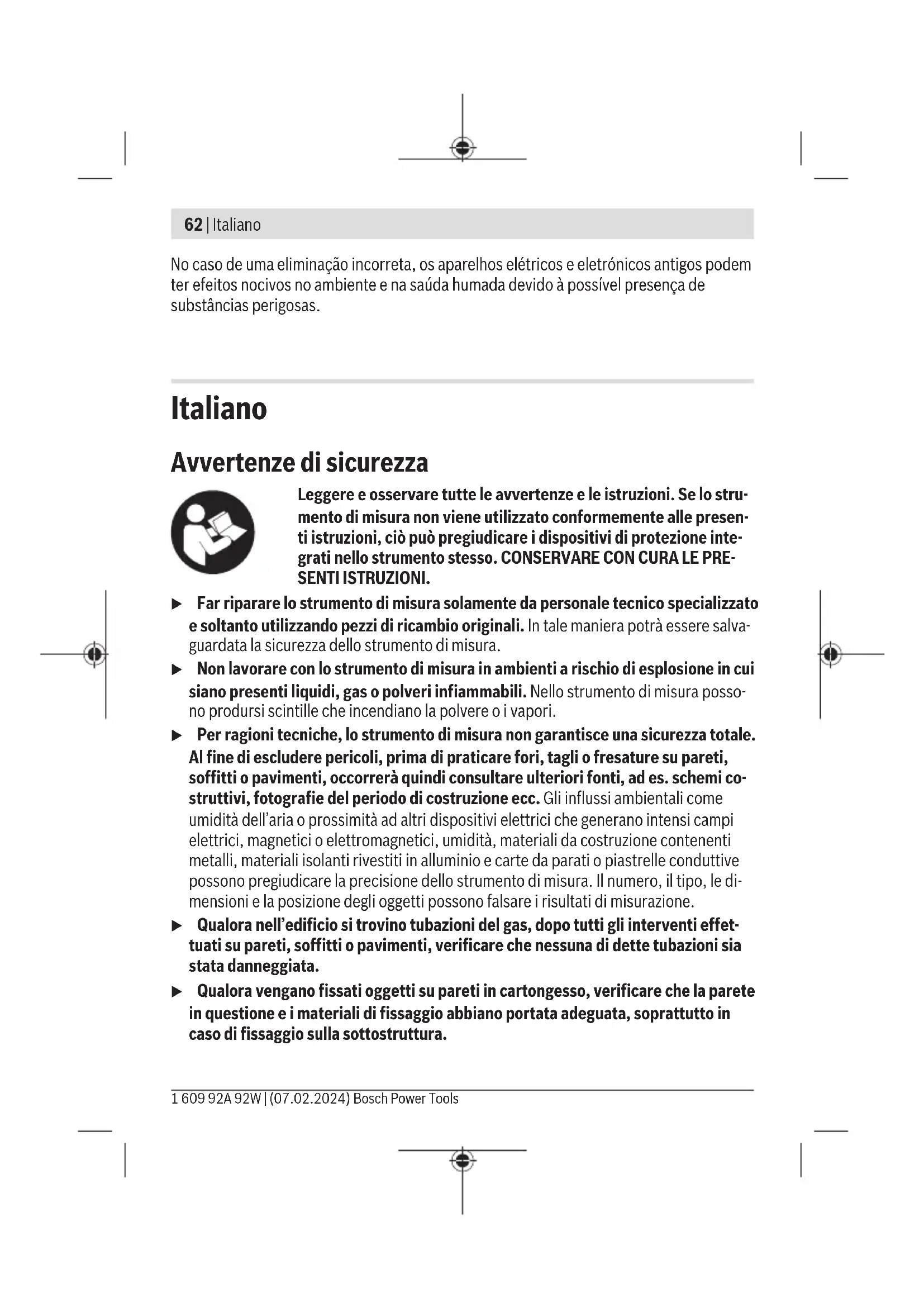 Alimentazione – Pile a stilo (alcaline al manganese) 2×1,5VLR6(AA) – Batterie (NiMH) 2×1,2VHR6(AA) – Batteria al litio (accessorio) 3,7V Autonomia, circa – Con pile a stilo (alcaline al manganese) 9h – con batterie (NiMH) 9h – Con batteria al litio (accessorio) 7h Peso – Con pile a stilo (alcaline al manganese)/batterie (NiMH) 0,28kg – Con batteria al litio (accessorio) 0,26kg Dimensioni(lunghezza×larghezza×altezza) 186×86×33mm Grado di protezione IP54 Batteria al litio (accessorio) BA3.7V1.0AhA Codice prodotto 1607A350N8 1 609 92A 92W | (07.02.2024) Bosch Power ToolsItaliano | 65 Rilevatore digitale GMS100-23 1607A3517H A) In base a materiale e dimensioni degli oggetti, nonché al materiale e allo stato del fondo sotto- stante B) per tubi di rame con diametro di 15mm C) per acciaio per armatura con diametro di 12mm D) Profondità di rilevamento minore in caso di cavi non sotto tensione E) Presenza esclusivamente di contaminazioni non conduttive, ma che, in alcune occasioni, posso- no essere rese temporaneamente conduttive dalla condensa. Per un’identificazione univoca dello strumento di misura, consultare il numero di serie (14) riportato sulla targhetta identificativa. u Un fondo dalle caratteristiche sfavorevoli può compromettere la precisione e la profondità di localizzazione del risultato di misurazione. Alimentazione strumento di misura Lo strumento di misura è alimentabile con comuni pile, con batterie NiMH reperibili in commercio o con una batteria al litioBosch disponibile come accessorio. Per il funziona- mento con batteria al litio, osservare le relative istruzioni d’uso. Avvertenza: non conservare mai lo strumento di misura senza avere inserito il coperchio vano batterie(12) o la batteria al litio, soprattutto in ambienti polverosi o umidi. Inserimento/sostituzione delle pile Per il funzionamento dello strumento di misura, si consiglia di utilizzare pile alcaline al manganese, oppure batterie NiMH. Per aprire il coperchio del vano batterie(12) premere sul dispositivo di bloccaggio(13). Prelevare il coperchio del vano batterie. Introdurre le pile a stilo o le batterie ricaricabili. Durante tale fase, prestare attenzione alla corretta polarità, riportata sul lato interno del vano batterie. Inserire il coperchio vano batterie(12) e fare in modo che si agganci. Sostituire sempre contemporaneamente tutte le pile, o tutte le batterie. Utilizzare esclu- sivamente pile o batterie dello stesso produttore e della stessa capacità. u Se lo strumento di misura non viene impiegato per lunghi periodi, prelevare le pi- le o le batterie dallo strumento stesso. Qualora le batterie rimangano per lungo tempo all’interno dello strumento di misura si possono verificare fenomeni di corro- sione e di autoscaricamento. Bosch Power Tools 1 609 92A 92W | (07.02.2024)66 | Italiano Utilizzo u Proteggere lo strumento di misura da liquidi e dall’esposizione diretta ai raggi solari. u Non esporre lo strumento di misura a temperature o ad oscillazioni termiche estreme. In caso di forti oscillazioni di temperatura, lasciare che lo strumento di misura raggiunga la normale temperatura prima di accenderlo. Temperature o sbalzi di temperatura estremi possono pregiudicare la precisione dello strumento di misura. u Evitare di urtare violentemente o di far cadere lo strumento di misura. A seguito di forti influssi esterni o di evidenti anomalie di funzionamento, sarà necessario far controllare lo strumento di misura presso un Centro Assistenza autorizzato Bosch. u Tenere l’elettroutensile esclusivamente sulle apposite superfici di presa (8), per non influenzare la misurazione. u Non applicare targhette adesive, né di altro genere, nel campo del sensore(11) sul retro dello strumento di misura. In particolare, le targhette in metallo influiscono sui risultati di misurazione. Durante la misurazione, non indossare guanti e provvedere a un’adeguata messa a terra. Una messa a terra inadeguata può pregiudicare il rilevamento di cavi sotto tensione. Durante la misurazione, evitare di trovarsi in prossimità di dispositivi che emettono intensi campi elettrici, magnetici o elettromagnetici, ad es. te- lefoni cellulari, laptop o tablet. Laddove possibile, per tutti i dispositivi la cui radiazione possa pregiudicare la misurazione, disattivare le relative funzioni, oppure spegnere i dispositivi stessi. Messa in funzione Accensione/spegnimento u Prima di accendere lo strumento di misura, accertarsi che il campo del sensore(11) non sia umido. All’occorrenza, asciugare lo strumento di misura con un panno. u Qualora lo strumento di misura sia stato esposto ad un forte sbalzo di temperatu- ra, raggiunga la normale temperatura prima di accenderlo. Per accendere lo strumento di misura, premere il tasto di accensione/spegnimento(7). Per spegnere lo strumento di misura, premere nuovamente il tasto di avvio/arresto(7). Se per circa 5min non verrà premuto alcun tasto sullo strumento di misura, né vengono rilevati oggetti, lo strumento stesso si spegnerà automaticamente. 1 609 92A 92W | (07.02.2024) Bosch Power ToolsItaliano | 67 Attivazione/disattivazione del segnale acustico Con il tasto del segnale acustico(6) è possibile attivare e disattivare il segnale acustico. Principio di funzionamento (vederefig.A) Lo strumento di misura esamina il fondo sottostante al campo del sensore(11) nella di- rezione di misurazione A fino alla profondità di rilevamento massima. A ogni misurazione vengono cercati automaticamente gli oggetti metallici (ad esempio, tubi di rame o armature) e i cavi sotto tensione (50-60Hz). Misurazione (vedere fig.B) Appoggiare lo strumento di misura sulla superficie da esaminare. La ghiera luminosa(2) si accende per visualizzare la disponibilità alla misurazione. Tenere lo strumento di misura in modo uniforme sulla superficie di presa(8). Non cam- biare la presa durante la misurazione e soprattutto non toccare l'area del sensore(11). Spostare lo strumento di misura sempre in
