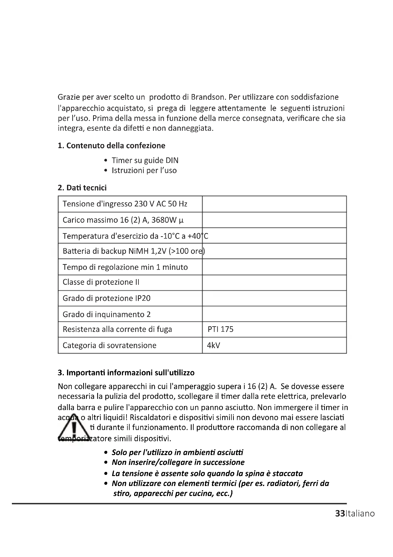 Grazie per aver scelto un prodotto di Brandon. Perutilizzare con soddisfazione l'apparecchio acquistato, si prega di leggere attendamente le seguenti istruzioni per l'uso. Prima della messa in funzione della merce consecnata, verificare che sua integra, esente da difetti e non danneggiata.