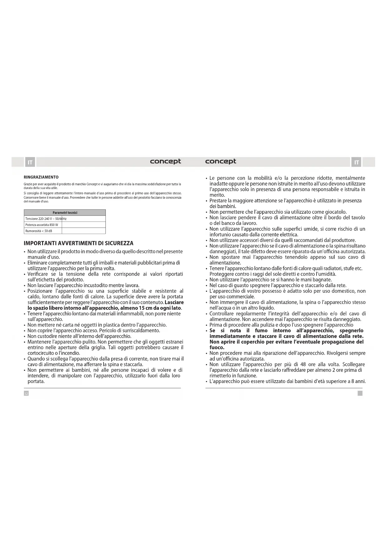 - I sacchetti in polietilene (PE) possono essere recuperati come rifiuto differenziato. Riciclaggio del prodotto alla fine della sua vita utile L’apparecchio è identificato in conformità alla Direttiva 2012/19/EU del Parlamento europeo e del Consiglio sui rifiuti di apparecchiature elettriche ed elettroniche (WEEE). Il simbolo riportato sul prodotto indica che il prodotto stesso non può essere smaltito come rifiuto urbano. Va portato in un centro di raccolta dei rifiuti elettrici ed elettronici. Provvedendo allo smaltimento corretto del prodotto si può prevenire l’impatto negativo sull’ambiente e/o sulla salute umana nel caso di mancato riciclaggio. Lo smaltimento deve essere effettuata in conformità alle norme regolanti la gestione dei rifiuti. Le maggiori informazioni sulle modalità dello smaltimento del prodotto sono reperibili presso l’ufficio locale di amministrazione pubblica oppure nel negozio dove il prodotto è stato acquistato. Il presente prodotto rispetta tutti i requisiti elementari stabiliti dalle normative EU inerenti. Il produttore si riserva di apportare le modifiche ai testi relativi al prodotto, al suo disegno e alle relative specifiche tecniche senza preavviso.58 59 ESES AGRADECIMIENTO Gracias por comprar este producto de la marca Concept y esperamos que quede satisfecho con él durante todo el tiempo que lo use. Antes de usar el producto, lea con cuidado todo el manual y luego guárdelo. Asegúrese de que las demás personas que vayan a utilizar el producto se familiaricen con el presente manual. Parámetros técnicos Tensión 220–240 V ~ 50/60 Hz Potencia de entrada 850 W Nivel de ruido < 50 dB